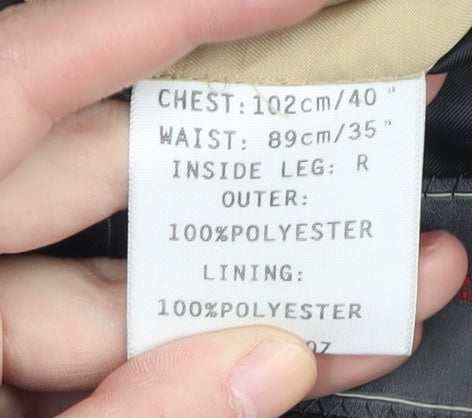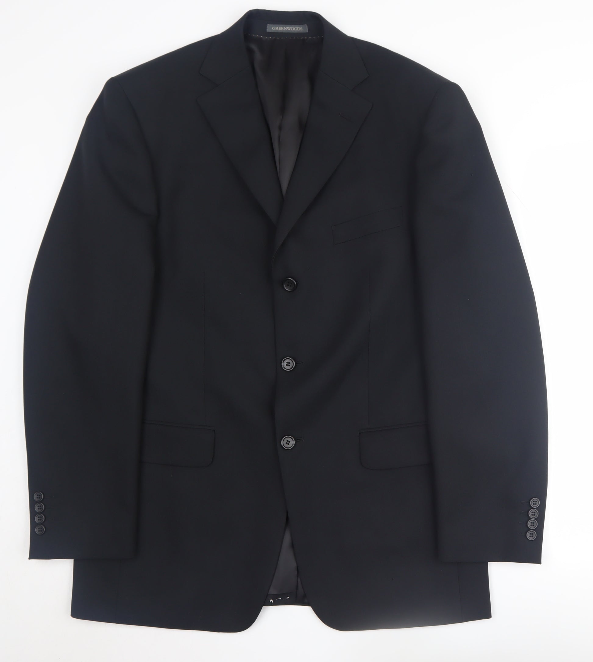 Presenting a sophisticated Greenwoods Men's Blazer in sleek black, perfect for adding a touch of classic elegance to your wardrobe. This jacket is crafted from 100% polyester, providing a durable yet refined look suitable for formal occasions and business settings. The single-breasted design, complete with a three-button front and notch lapel, enhances its timeless appeal. Offering practicality and style, the jacket features a regular length cut with a neat single-vented back, ensuring comfort and ease of movement. Designed to fit a chest size of 40, it boasts four-button sleeves that contribute to its tailored appearance. The polyester lining adds to the blazer's structured fit, making it a reliable choice for various formal occasions throughout the year. Although gently used, the blazer is in excellent condition with no visible signs of wear. Elevate your office or evening attire effortlessly with this elegant piece.