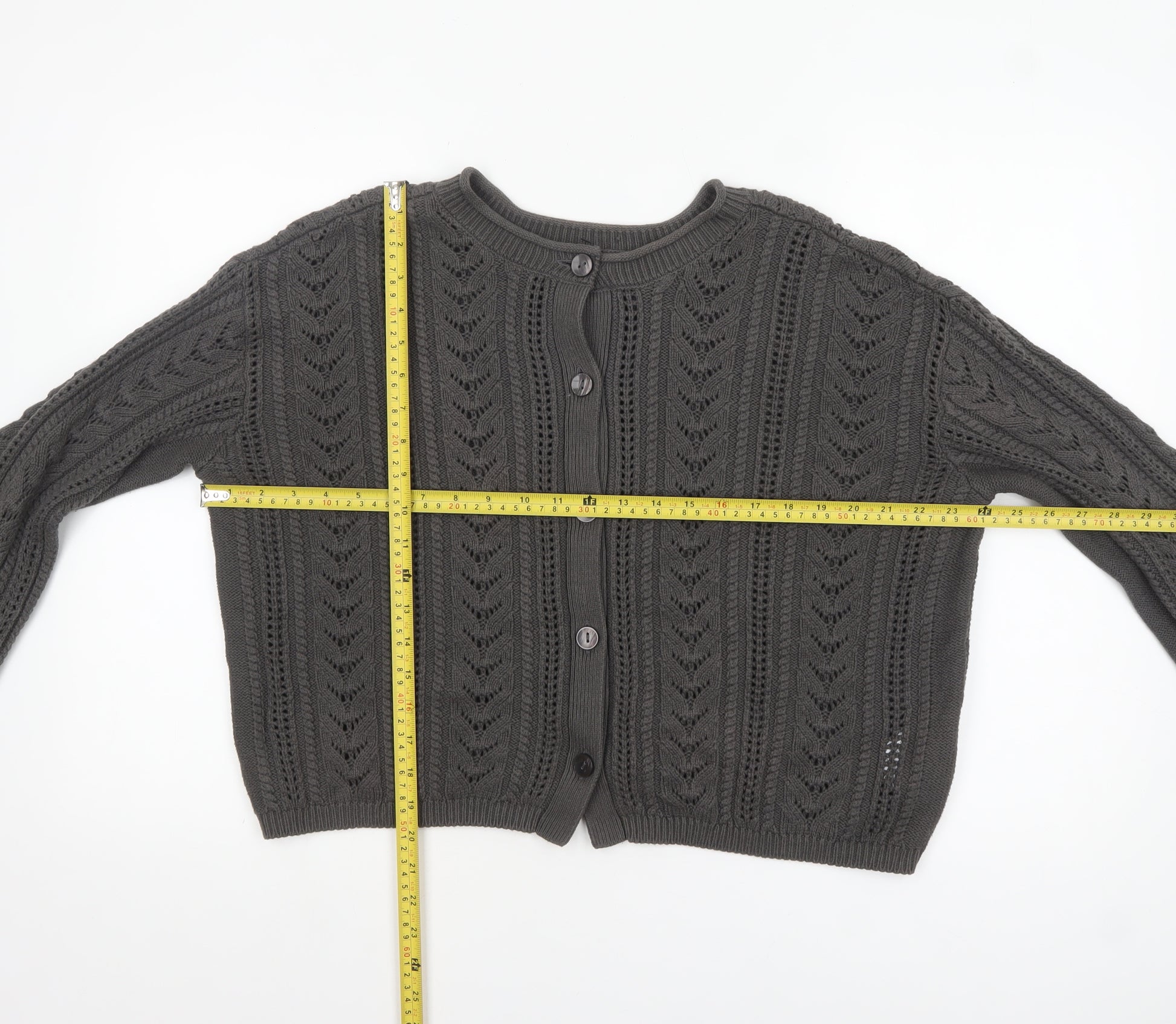 Add a versatile layer to your cold-weather collection with this stylish women’s grey button-up cardigan from GU. Crafted in a breathable open-knit design, this piece combines cosy warmth with lightweight comfort, making it perfect for transitional seasons like spring, autumn, and cooler winter days. The cardigan features a classic crew neckline and full-length sleeves, maintaining a timeless silhouette that complements both casual and semi-dressy outfits. Made from a soft cotton and acrylic blend, it offers the ideal balance of comfort, durability, and flexibility for everyday wear.Designed with a textured knit pattern, this cardigan provides subtle dimension and a refined finish. The button-front closure allows for versatile styling – wear it open over a tee or buttoned up for a neat, fitted look. The soft grey hue makes it incredibly easy to pair with jeans, dresses, or skirts, offering effortless coordination for a range of colour palettes. Whether layered for the office, cosy nights in, or a relaxed weekend outing, this cardigan ensures practicality without compromising on aesthetic appeal.This piece has been gently worn but remains in excellent condition with no visible signs of wear or damage. Suitable for regular fit preferences, its open-knit structure enhances breathability while adding a delicate texture to your wardrobe staples. With its quality material blend of 59% cotton and 41% acrylic, this cardigan is machine washable for easy maintenance.Perfect for those who value a clean, classic, and versatile look, this GU women’s cardigan is an ideal wardrobe essential for all seasons. A must-have layering piece that combines comfort, style, and effortless elegance — an excellent choice for casual outings, workwear layering, or cosy weekend lounging.