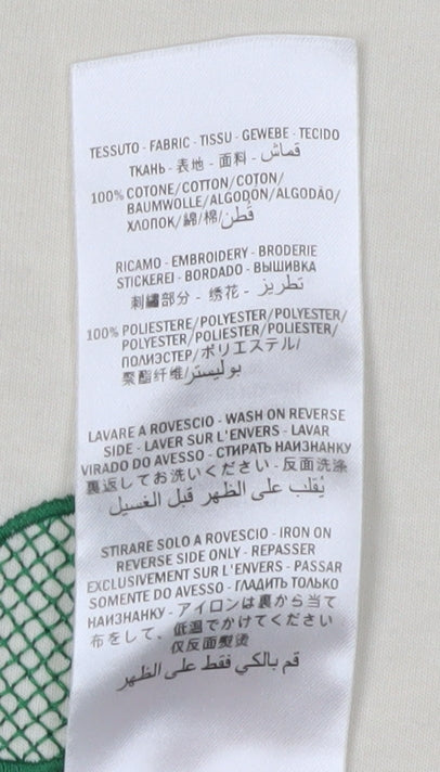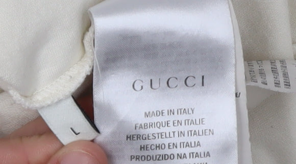 Step up your casual wardrobe with this luxurious Gucci Men's T-Shirt. Fashioned from premium 100% cotton jersey material, this beige T-shirt exemplifies both style and comfort, perfect for everyday wear. The shirt boasts a sporty graphic print featuring a tennis theme, honoring the Italian heritage of the brand through exquisite embroidered logos and accents. Designed for fashion-forward individuals, the regular fit and crew neck design offer a relaxed yet sophisticated look suitable for men of diverse tastes. Short sleeves ensure comfort without compromising on style, making it a versatile piece for any season. Though pre-loved, it remains in good condition with only light staining present on the front, which doesn't detract from its overall appeal. Ideal for fans of luxury and sports-inspired fashion, this T-shirt caters to those who appreciate iconic branding with an athletic twist. Secure your piece of this prestigious collection now, perfect for both casual outings and more curated fashion ensembles.