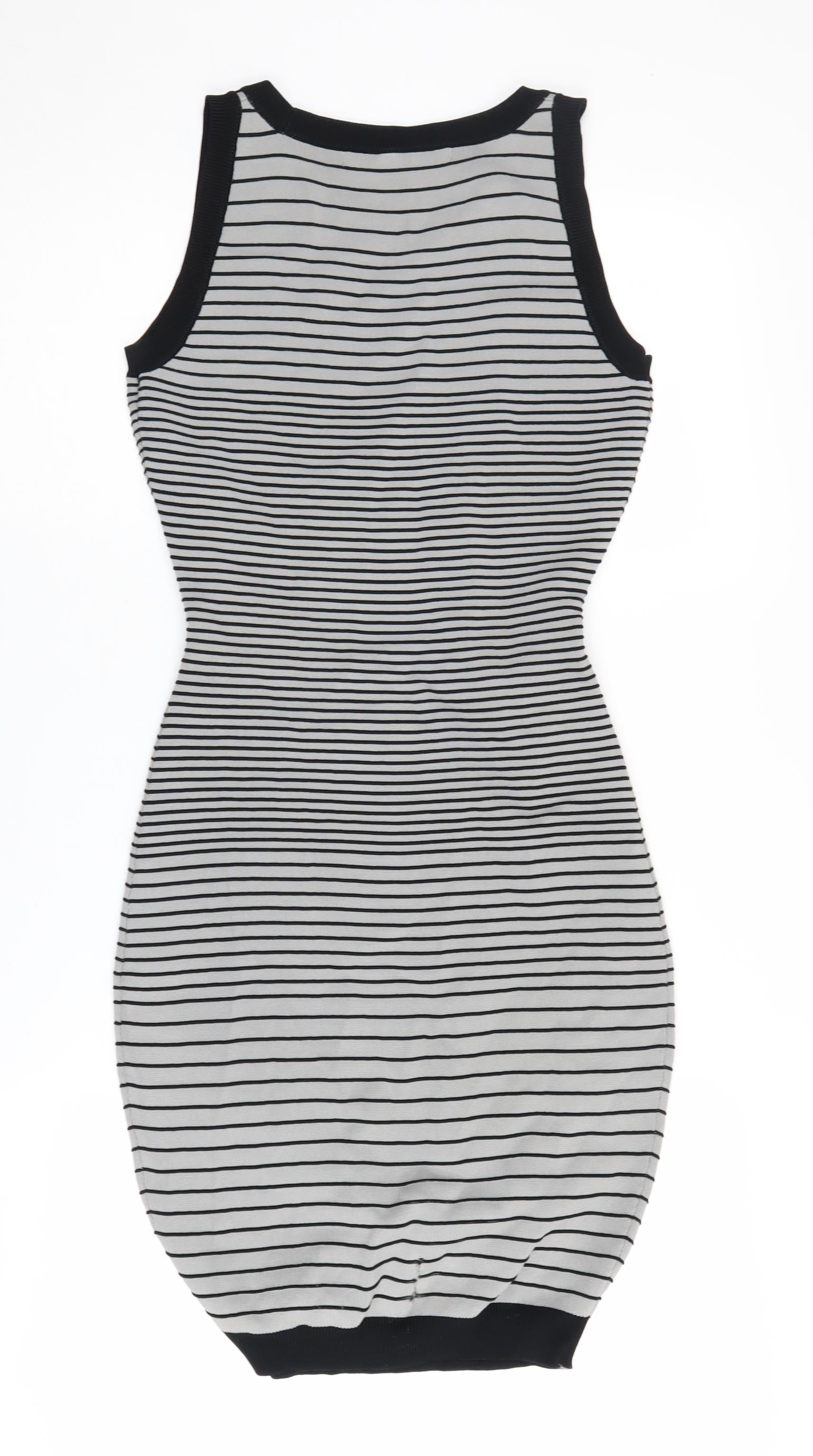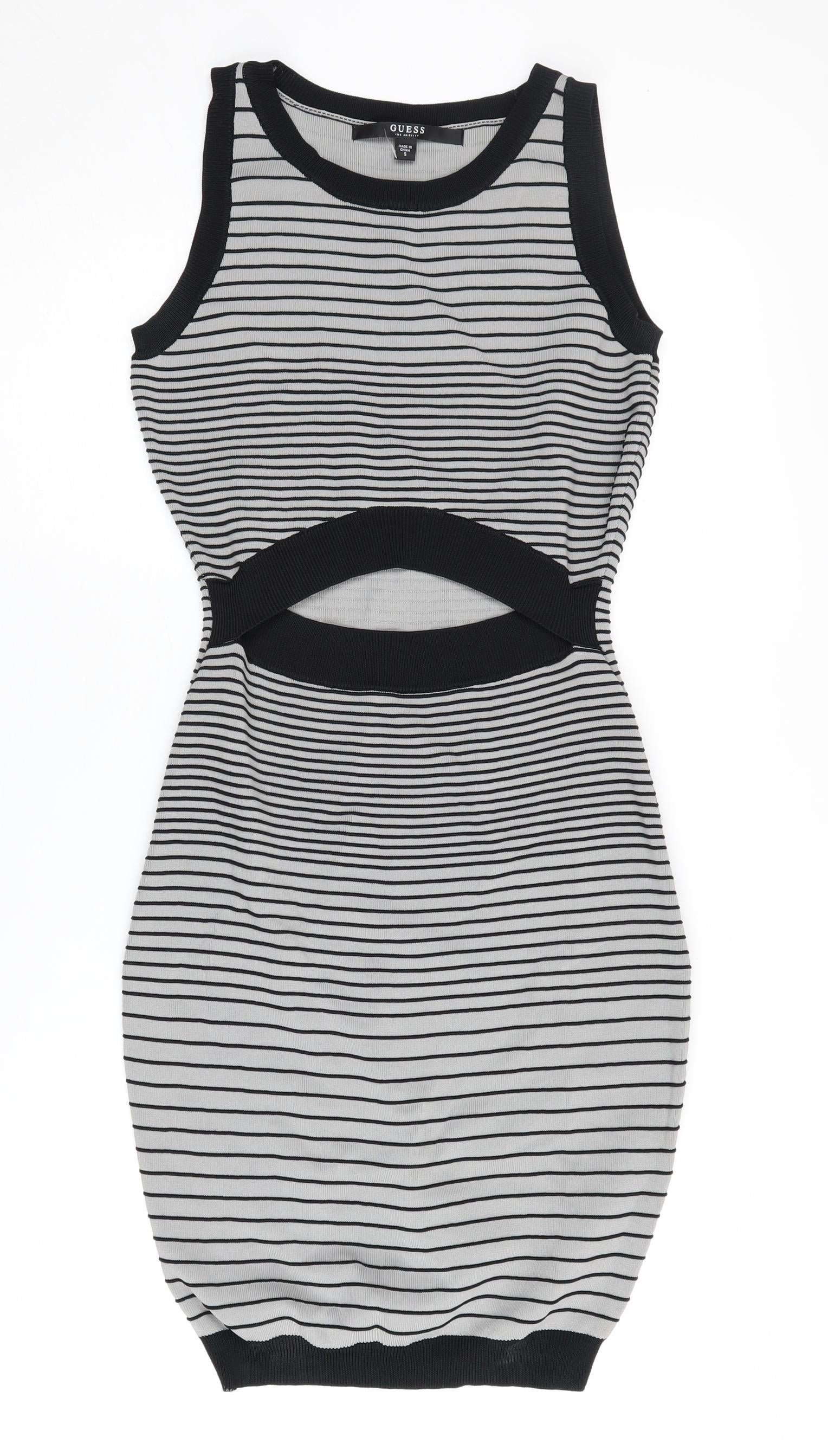 Turn heads with this striking and stylish black & white striped bodycon dress from Guess, designed to offer a sleek and contemporary look. Perfect for a casual day out, this dress features a modern sleeveless cut with a scoop neckline for a relaxed fit and stylish appeal. Made from a comfortable knit fabric blend of rayon, nylon, and elastane, it ensures a flattering silhouette and a snug yet relaxed wear. The cut-out accent adds an edgy twist, making it a standout piece for your wardrobe. A pullover closure enhances its convenience for everyday wear, while the strappy sleeves add a touch of elegance. Ideal for spring and summer outings, this regular-size dress is a versatile addition catering to women's fashion needs. Although the dress is pre-loved, it remains in good condition with a minor tear near the hem. It's perfect for those who love to make chic yet bold fashion statements. Grab this Guess dress to show off a blend of comfort and trendiness effortlessly.