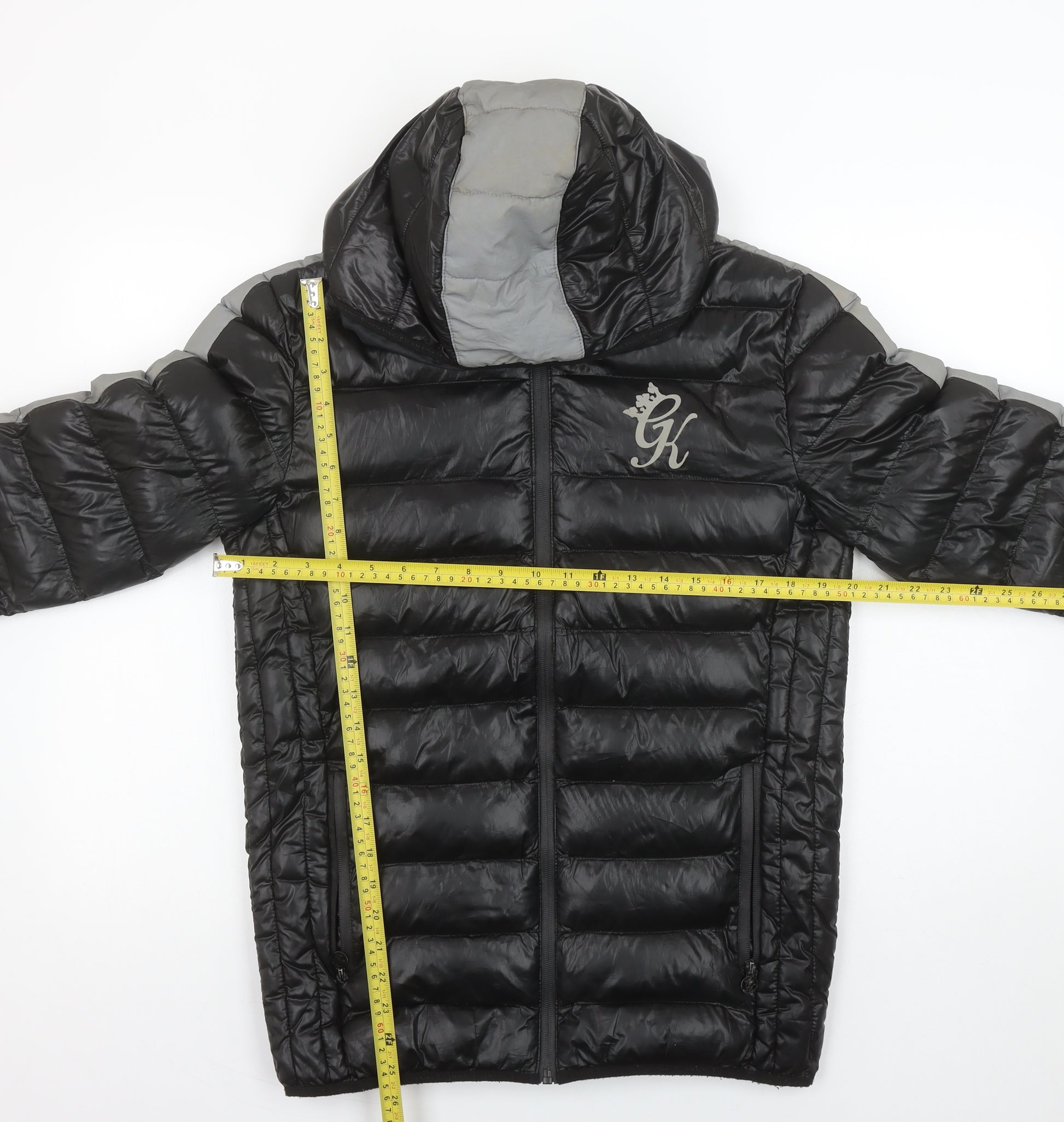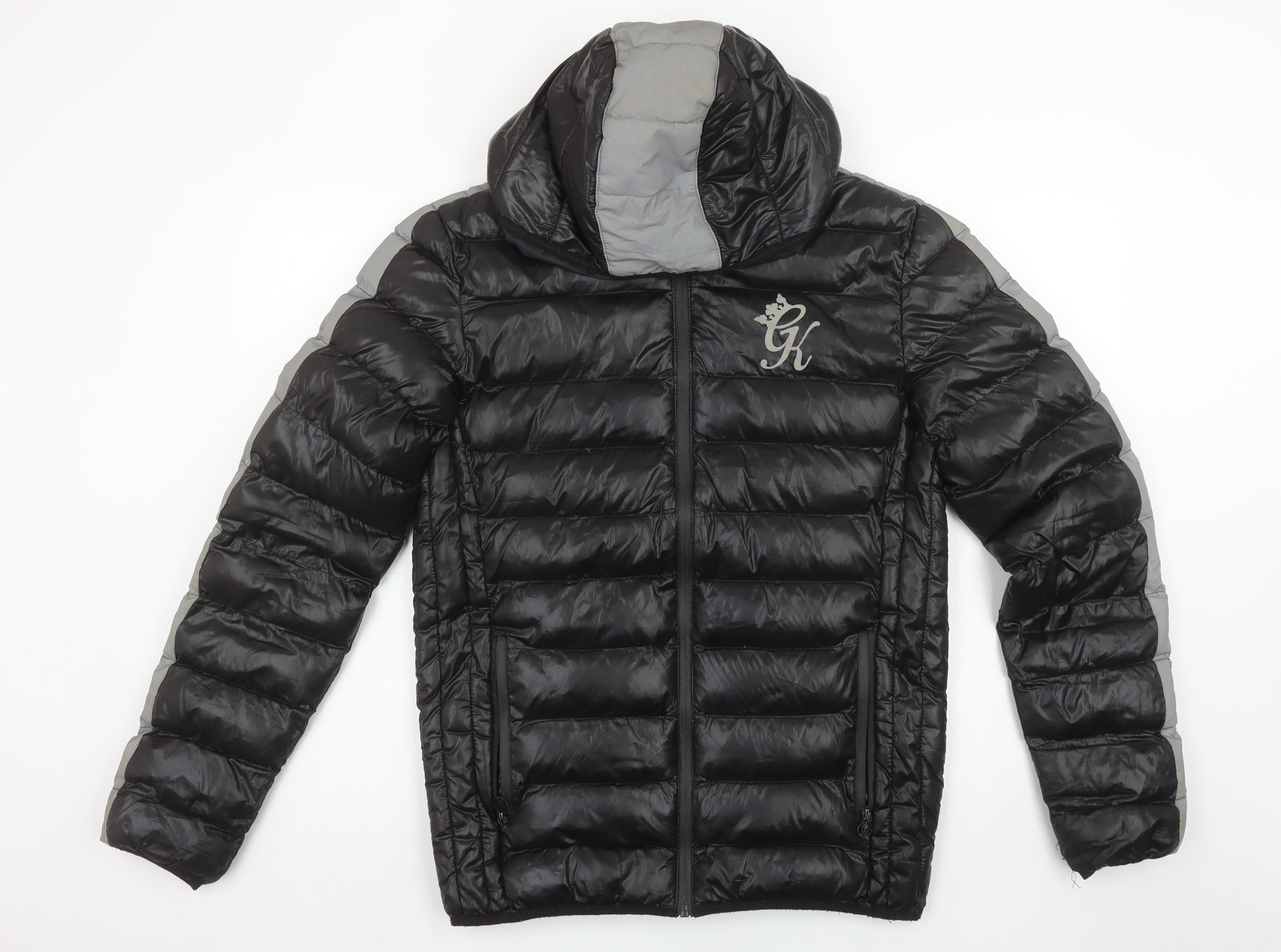 Stay warm and stylish with this Gym King men’s black puffer jacket in size small. Designed for comfort and practicality, this jacket is perfect for the colder months, offering a sleek urban look while keeping you insulated. The jacket features a durable black polyamide and polyester outer shell that provides excellent weather resistance and durability. Its padded synthetic insulation ensures warmth without unnecessary bulk, making it ideal for casual wear, commuting, or outdoor activities. It has a full front zip closure for ease of wear, convenient zipped pockets for your essentials, and an adjustable hood for extra protection against wind and rain.Inside, a smooth polyester lining adds comfort, while the stylish grey contrast detail on the hood and arms gives this jacket a modern sports-inspired appeal. The Gym King logo embellishment on the chest accentuates its premium casual aesthetic. Tailored with a regular fit and mid-length cut, it works well layered over hoodies or t-shirts.This jacket remains in good pre-owned condition with only a small tear on the sleeve, reflected in the price. Ideal for everyday wear, travel, or gym and training sessions, the jacket delivers reliable warmth with refined streetwear appeal. A great choice for men who value a balance of function and style in their outerwear, this Gym King puffer jacket complements casual urban outfits perfectly for winter and cold weather adventures.