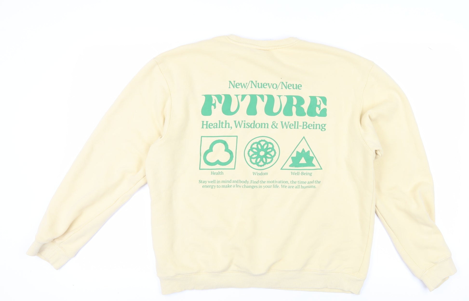 Discover the ultimate in casual comfort with this H&M beige pullover sweatshirt. Designed for unisex adults, this relaxed-fit sweatshirt is the perfect addition to your wardrobe for any season. Made from a soft blend of cotton and polyester, it features a cozy fleece fabric for an exceptionally comfortable wear. The clean design is accented by a stylish logo and a forward-looking graphic print, making it not just comfortable but also trendy. The sweatshirt's long sleeves and crew neckline offer a classic look, while the relaxed fit ensures that it hangs comfortably on any frame. Easy to care for, this machine-washable sweatshirt offers practicality alongside style. Ideal for casual outings or simply relaxing at home, its no-pattern design makes it a versatile piece. Though slightly worn, it remains in excellent condition with no damage, ensuring a fresh and inviting wear every time. An appealing option for anyone seeking comfort without sacrificing style, this sweatshirt is as fitting for a laid-back day out as it is for a quiet evening in. Priced competitively, this piece offers outstanding value and fashion-forward appeal for those who appreciate an effortlessly chic attire.