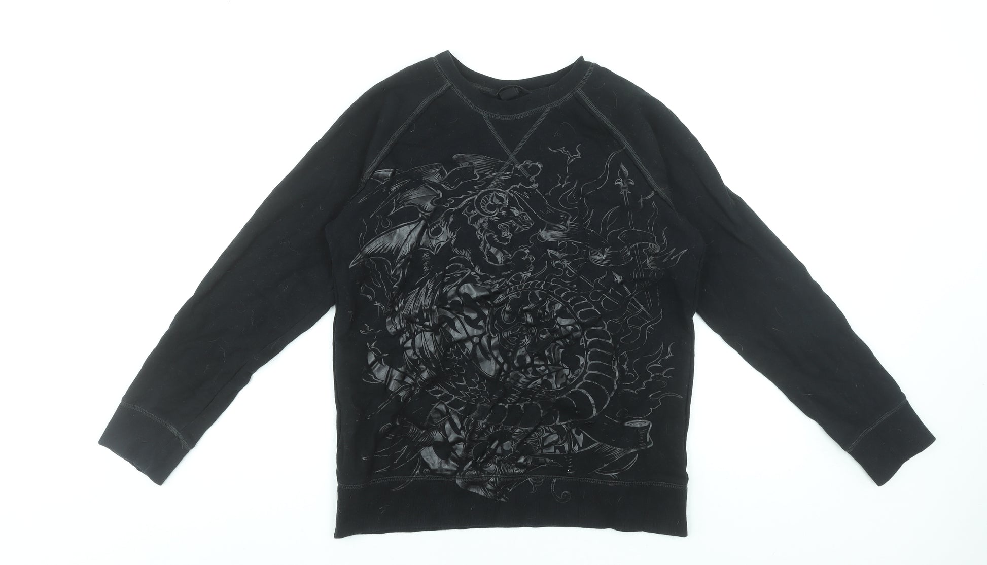 This H&M Boys Black Graphic Dragon Pullover Sweatshirt in size 14 Years is a bold and comfortable choice for any young wardrobe. Crafted from soft 100% cotton jersey, it delivers a cosy yet breathable feel, perfect for everyday wear across the cooler seasons. The front features a dramatic dragon-inspired print design, adding a touch of fantasy flair that makes it stand out from standard basics. The sweatshirt’s classic crew neck and long sleeve construction ensure warmth and ease of layering, while the pullover style provides all-day comfort and practicality.Ideal for casual wear, school days, or relaxed weekend outings, this piece combines comfortable functionality with stylish graphic detailing. The black colour makes it versatile and easy to pair with jeans, joggers, or chinos, suiting a range of looks from sporty to streetwear-inspired. Neat stitching and H&M’s renowned quality give it a reliable and durable finish that resists everyday wear and tear.Although gently pre-owned, the sweatshirt remains in very good condition with no rips, holes, or stains. Only minor lint is visible, which can easily be removed with standard garment care. Machine washable at home for easy maintenance, this hoodie will keep its colour and structure wash after wash. Its cotton construction ensures natural softness against the skin while allowing freedom of movement, making it suitable for both school activities and leisure time. The striking dragon motif channels a fun sense of adventure, perfect for a boy with a creative imagination or love of fantasy designs.A stylish, quality wardrobe addition from H&M’s Young collection, this piece promises both comfort and attitude. Whether layered under a jacket for outdoor wear or worn alone indoors, it’s a go-to sweatshirt for reliable warmth and expressive style. Perfect for autumn, spring, or winter months, this durable pullover blends classic comfort with eye-catching design, ideal for any young trendsetter ready to add a little edge to their daily look.