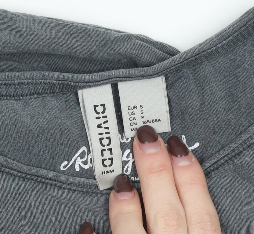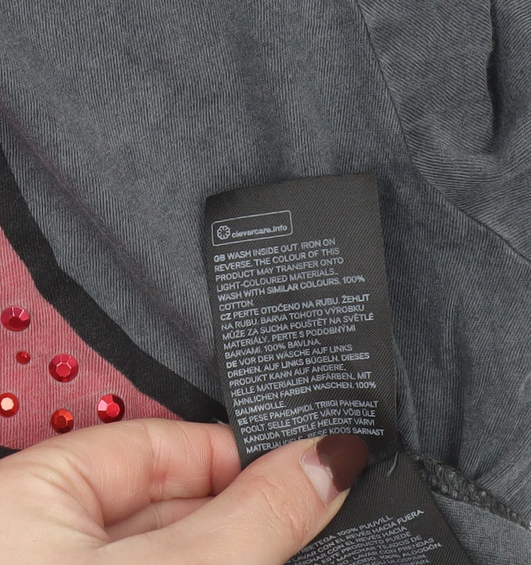 Showcase your timeless rock style with this officially licensed H&M Divided women’s T-shirt featuring the iconic tongue and lips graphic from The Rolling Stones. Crafted from 100% cotton jersey, this short-sleeved top offers a lightweight and breathable feel, ideal for relaxed everyday wear or concert-ready outfits. The soft grey fabric gives off a subtle vintage wash effect, while the front design is embellished with small red beaded accents that add a touch of texture and sparkle to the classic image. Designed with a standard crew neckline and regular fit, it’s comfortable, flattering, and easy to style with jeans, denim shorts, or a leather jacket. The short sleeves and natural feel of cotton make it perfect for seasonal versatility – wear it in spring or summer on its own, or layer it under a hoodie or blazer as the weather cools. This top is machine washable for easy care and retains its soft, lived-in look wash after wash. If you love iconic rock imagery and understated edge, this piece is a wardrobe essential that adds an effortless touch of attitude to any outfit. Pair it with your favourite trainers for a casual day out or dress it up with accessories for an urban night look. Whether you’re a fan of The Rolling Stones or simply appreciate bold graphic tees, this H&M Divided design captures authentic musical heritage with a fresh, fashion-forward twist – perfect for modern women who embrace individuality and comfort in equal measure.