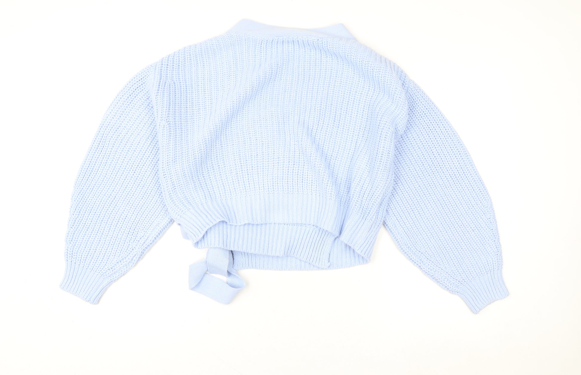 This lovely H&M Divided women's wrap jumper is a perfect choice for anyone wanting both comfort and contemporary style. Crafted from soft 100% acrylic knit fabric, the jumper feels cosy while remaining lightweight and breathable — ideal for transitional seasons like spring, autumn, or even layering during winter. The jumper features a flattering wrap design with a stylish tie detail at the waist, creating a bow accent that enhances the feminine silhouette. A V-neckline adds a touch of sophistication while allowing easy pairing with camisoles or shirts underneath. Designed in a soft pale blue colour, it brings a fresh, calming look to any outfit. The chunky-knit texture provides added depth and visual appeal, while the ribbed cuffs and hem ensure a comfortable, snug fit. With its long balloon sleeves and cropped cut, it blends casual charm with chic appeal, making it versatile enough for both daywear and casual evening looks. The regular fit offers unrestricted comfort, perfectly balancing form and function. Whether styled with high-waisted jeans, skirts, or layered over dresses, this jumper easily adapts to your wardrobe. Machine washable and easy to care for, it’s a practical addition to your collection. In excellent pre-loved condition with no visible flaws, this piece still retains its shape and softness. Its quality and modern detailing make it a wonderful choice for everyday wear or casual outings, embodying H&M’s commitment to accessible fashion with a trendy twist. Ideal for women who love relaxed yet stylish knitwear, this wrap jumper combines elegance, comfort, and effortless wearability. Add a touch of simplicity and chic Scandinavian charm to your wardrobe today with this versatile blue wrap jumper from H&M Divided.