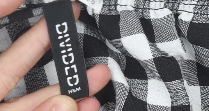 Elevate your summer wardrobe with this chic and stylish H&M Divided women’s cropped blouse, perfect for casual outings and sunny days. Crafted from a comfortable and lightweight woven blend of 98% polyester and 2% elastane, this trendy top offers just the right amount of stretch for a flattering and comfortable fit. Designed in a classic black and white check pattern, it brings timeless charm combined with a modern, playful twist. Featuring an off-the-shoulder neckline and voluminous puff sleeves, this top beautifully frames the shoulders while staying securely in place with its elasticated upper edge. The front button fastening adds a touch of detail and complements its structured yet relaxed look. Its cropped length paired with a gently ruched hemline adds a contemporary edge, making it ideal for pairing with high-waisted jeans, skirts or shorts for a laid-back but stylish outfit. Suitable for casual occasions, this piece is perfect for warm-weather wear during the summer season. The lightweight woven fabric ensures breathability while the regular fit keeps it versatile and wearable throughout the day. Whether you're heading to a summer picnic, a daytime city stroll, or meeting up with friends, this blouse will help you stand out effortlessly. In excellent condition with minimal signs of previous wear and no visible flaws, this is a fashionable and practical piece that is ready to be loved again. Combine comfort with timeless style and make this black checked off-the-shoulder blouse an essential addition to your seasonal collection. Don’t miss out on this affordable style staple from H&M Divided.