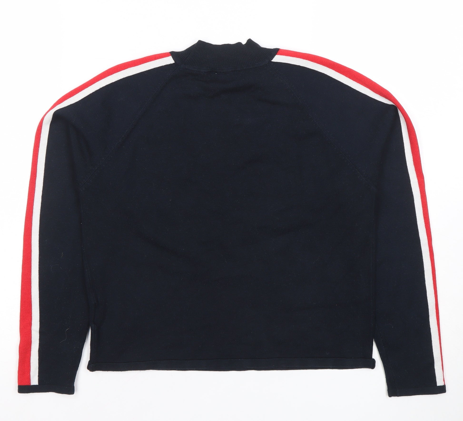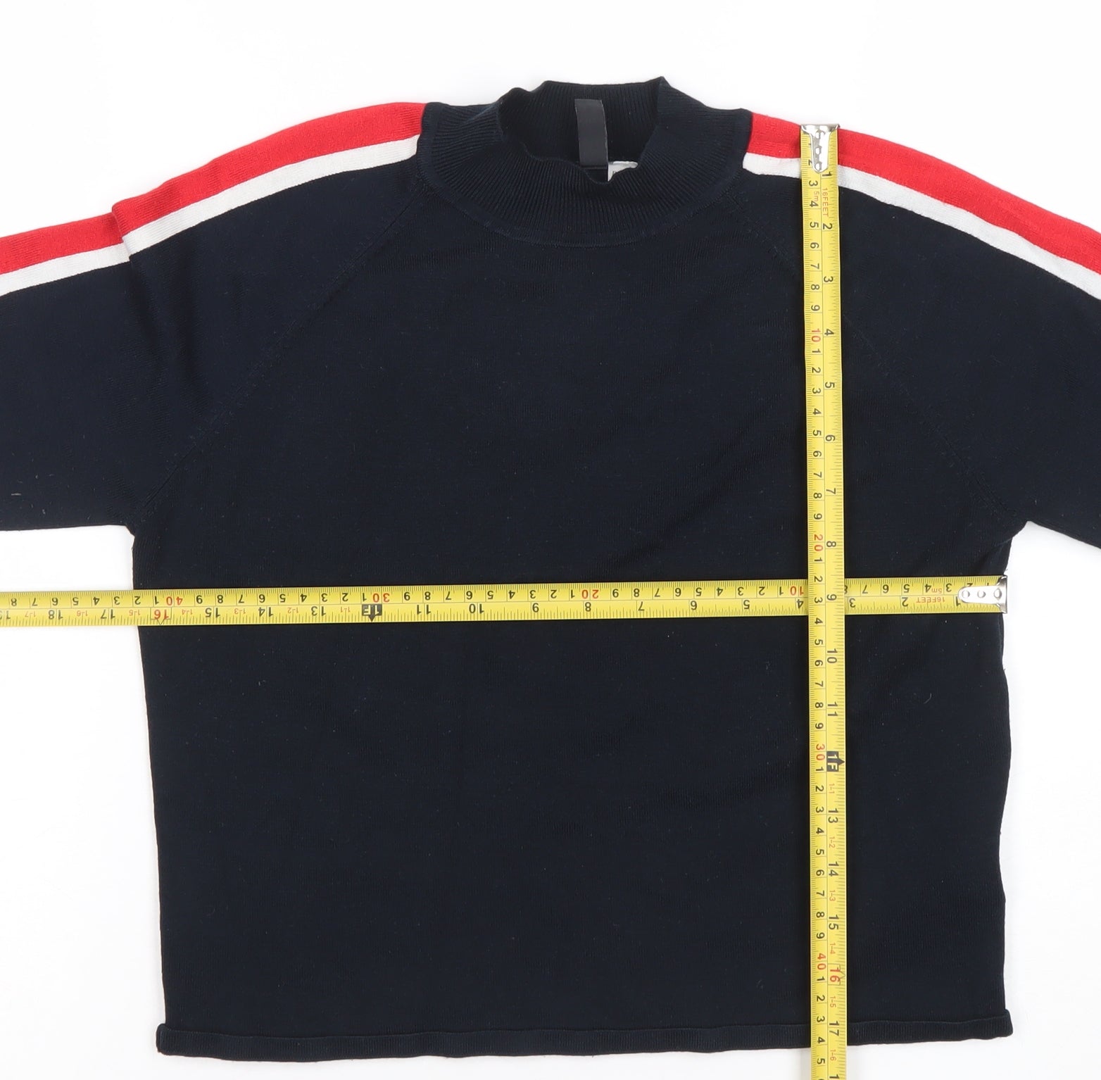 Elevate your everyday wardrobe with this sleek and sporty H&M Divided women’s mock neck top, an effortlessly versatile piece that blends comfort with contemporary style. Crafted from a lightweight knit fabric featuring a blend of viscose and acrylic, this long sleeve T-shirt offers a soft, breathable feel with gentle stretch, ensuring a comfortable fit whether you're at work, out shopping or enjoying a casual weekend. The black main body is contrasted by striking red and white stripes down the sleeves, adding a modern, athletic-inspired edge to the design. With its mock neckline and raglan sleeve cut, this top provides a flattering silhouette that pairs seamlessly with jeans, skirts or tailored trousers. Perfect for layering under jackets or wearing on its own, it transitions easily across seasons, especially suited for autumn and winter wear. The minimalist solid colour and subtle sporty detailing make it ideal for casual everyday occasions, from coffee dates to relaxed office days. The pullover style ensures ease of wear, while the breathable knit fabric keeps you comfortable throughout the day. With its Regular fit, it flatters the natural shape without being too loose or tight, embodying that effortless H&M Divided streetwear vibe. Machine washable for easy care, this top is designed to offer both practicality and fashion-forward appeal. In excellent pre-loved condition with only light signs of wear, it remains a stylish and affordable wardrobe essential ready to elevate your basics edit. Whether layered under a denim jacket or worn with high-waisted trousers, this H&M Divided black knit top delivers comfort, style and versatility in one timeless piece. Grab this chic, lightweight mock neck top today to add a polished casual look to your wardrobe at a great price.