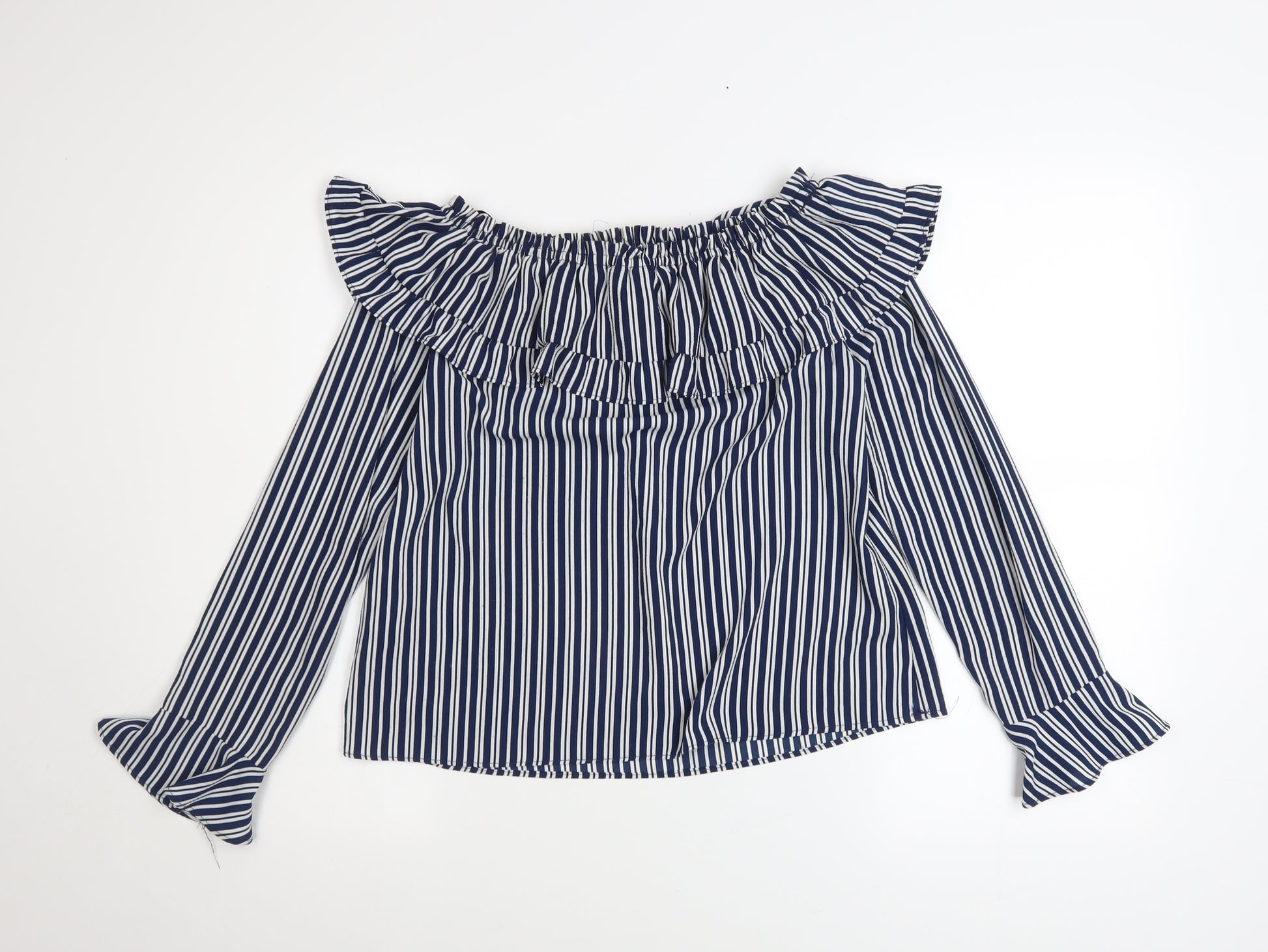 Add a touch of feminine charm to your spring and summer wardrobe with this stylish blue striped blouse from H&M’s Divided collection. Designed for women who love understated elegance with a playful twist, this off-the-shoulder tunic-style top captures a timeless nautical aesthetic. Crafted from a lightweight and breathable jersey fabric blend of 97% polyester and 3% elastane, the blouse offers a comfortable stretch fit that moves effortlessly with you throughout the day.The striking navy and white vertical stripes elongate the silhouette, while ruffled accents along the neckline and sleeves lend a soft, romantic finish. The flared long sleeves add a fashion-forward edge, and the elasticated off-shoulder neckline allows versatile styling—wear it casually off the shoulders for an evening out or slightly higher for a more relaxed look.Finished in a flattering regular fit, this blouse is perfect for casual occasions, weekend trips, or laid-back gatherings. Pair it with jeans, tailored shorts, or a skirt to create endless outfit options. The pullover design ensures ease and simplicity, making it ideal for everyday wear without compromising on style.This garment is in excellent pre-owned condition, showing minimal signs of wear and no visible flaws. Carefully machine washable, it is designed for effortless care and longevity. Whether dressing up for lunch with friends or adding polish to your daytime outfit, this H&M Divided striped ruffle blouse is a versatile wardrobe staple that brings comfort, fashion, and femininity together seamlessly.A perfect choice for women who appreciate effortless chic, timeless patterns, and details that stand out without overstatement. Add this beautifully crafted piece to your collection and enjoy a classic striped blouse that never goes out of style.