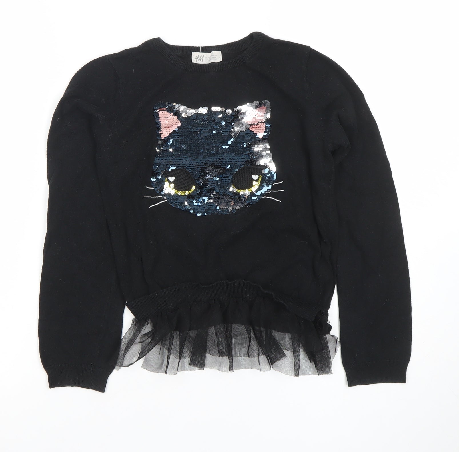 Girls Black Sequin Cat Pullover Long Sleeve T-Shirt 10 Years