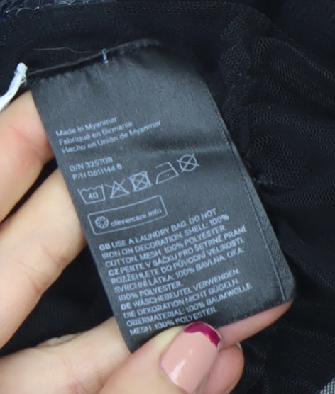 Add a playful touch to your child’s wardrobe with this adorable girls’ black sequin cat pullover from H&M. Designed from soft and breathable cotton fabric with a comfortable polyester trim, this charming long sleeve T-shirt offers a cosy and stylish option for everyday wear in cooler seasons. The standout feature is a reversible sequin cat face design on the front, shimmering in shades of black, pink, and silver to create a fun, eye-catching look that kids will love. Crafted with attention to comfort, it features a regular fit with ribbed cuffs and neckline for ease of movement and an added touch of durability. A delicate mesh ruffle hem adds a feminine detail, giving the piece a layered, fashion-forward twist that pairs perfectly with jeans, leggings, or skirts. Ideal for casual outings, parties, or playtime, it’s both practical and full of character.Its soft knit construction ensures a lightweight, cosy feel, while the breathable cotton material helps to keep your little one comfortable throughout the day. This versatile T-shirt is easy to care for, being machine washable for added convenience. Perfect for autumn and winter days, it can be layered with a jacket or hoodie for extra warmth.This H&M sequin cat top is in excellent pre-loved condition, showing only minimal signs of gentle wear and no visible flaws. Without original sales tags, it remains ready for its next adventure — a wonderful choice for parents seeking quality, style, and playful charm at great value. A fantastic wardrobe staple that combines fun design with everyday practicality, sure to delight any young animal lover.