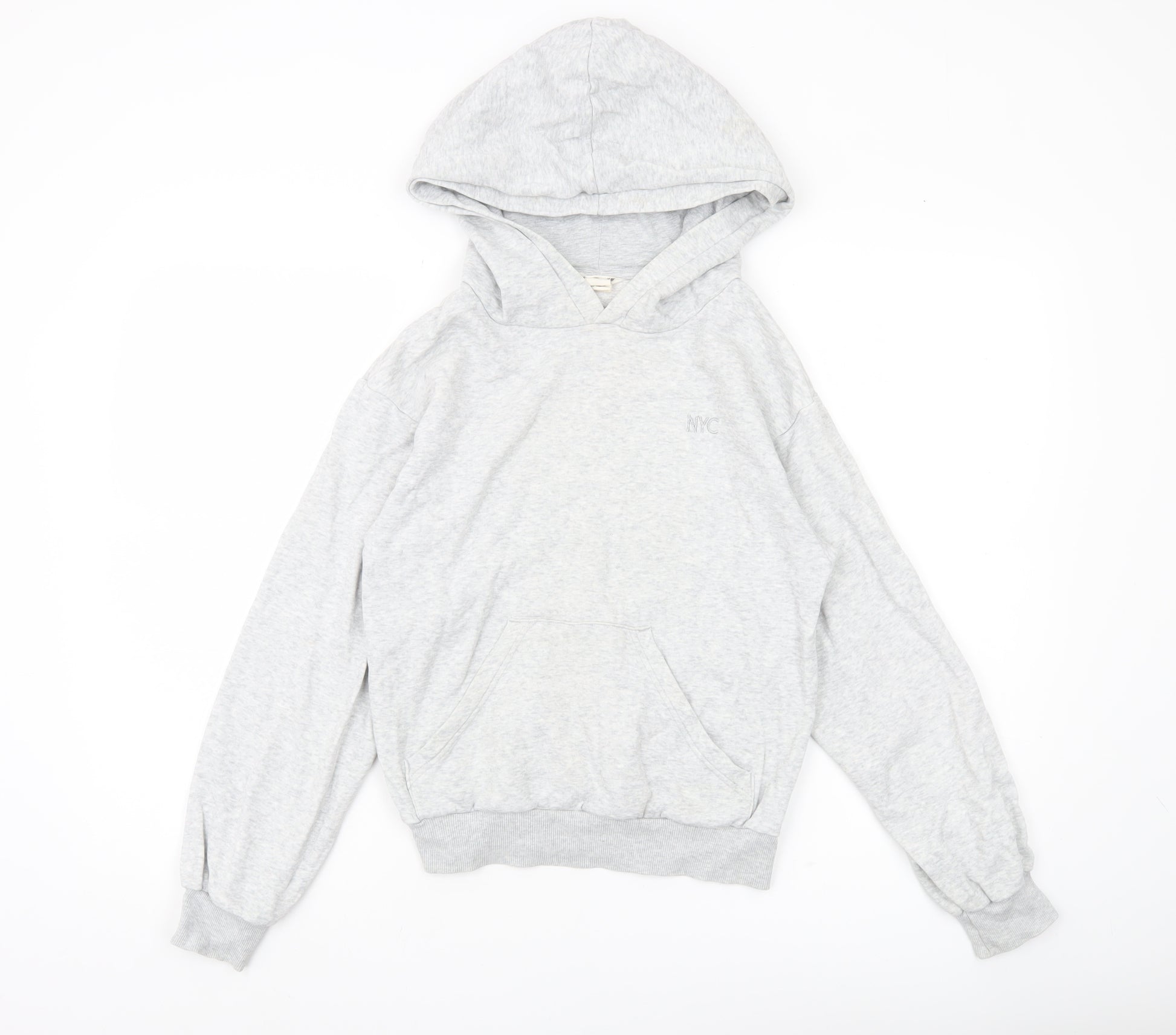 Refresh your child’s casual wardrobe with this stylish grey pullover hoodie from H&M, designed especially for girls who love comfort with a touch of urban style. Crafted from a high-quality blend of 75% cotton, 15% polyester, and 10% viscose, this hoodie is soft to the touch, breathable, and designed to keep them comfortable throughout the day. The lightweight jersey fabric makes it perfect for layering in the autumn, spring, and cooler winter months.Featuring a classic pullover style with a cosy hood and practical kangaroo front pocket, this hoodie has all the essential features your young one needs for everyday wear. The subtle embroidered 'NYC' logo detail on the chest adds a fashionable city-inspired accent without overwhelming the simple design. Its long sleeves, ribbed cuffs, and hemline provide a snug fit while ensuring durability for everyday activities, whether it’s for wearing at school, on casual outings, or simply relaxing at home.The clean grey colourway makes this hoodie versatile and easy to pair with jeans, joggers, or leggings, offering endless styling options. Designed in a regular fit with a classic crew neckline, it ensures easy wear and a flattering shape for growing girls. This hoodie is also machine washable, making it an effortless choice for busy parents who appreciate low-maintenance clothing.Although lightly worn, this hoodie remains in very good condition with no visible stains, rips, or defects, ensuring plenty of wear left for its next owner. While original retail tags are not attached, the quality and comfort of H&M’s design shine through in this piece.Whether you’re looking to add a reliable everyday layer for school or a comfy hoodie for playtime and casual outings, this H&M pullover hoodie is an excellent wardrobe addition offering both practicality and style. A must-have for any girl who loves comfort and easy-going fashion with a modern twist.