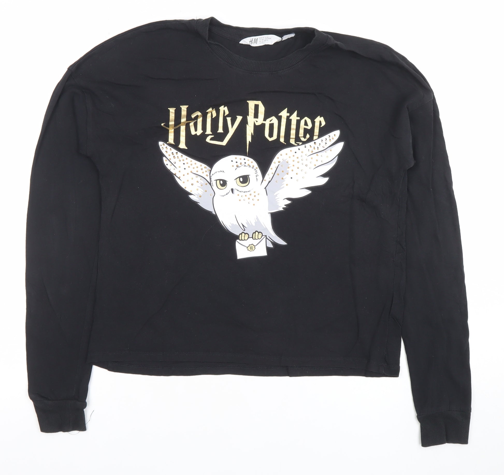 Bring a touch of wizarding wonder to any outfit with this charming H&M Girls Harry Potter Long Sleeve T-Shirt. In classic black with a magical gold and white Hedwig design on the front, it’s the perfect piece for young fans of the beloved Harry Potter series. Designed in soft, breathable cotton jersey, this comfortable tee is ideal for everyday wear, school days, or cosy weekends at home. The long sleeves and round crew neck make it great for layering during cooler seasons, while the relaxed, regular fit allows for easy movement and all-day comfort.Made from 100% cotton, the fabric feels gentle against the skin and is easy to care for with machine wash convenience. The metallic logo accents and glitter detailing on Hedwig’s feathers add a hint of sparkle that will delight any Harry Potter enthusiast without compromising its casual wearability. Perfectly sized for 14 years, this piece blends style, fandom, and comfort effortlessly.This pullover T-shirt works beautifully with jeans, leggings, or joggers for an easy everyday look. Ideal for casual occasions or relaxed weekends, it makes a fun and stylish addition to any young wardrobe. The graphic print brings a bit of Hogwarts magic to life, capturing the spirit of friendship and adventure from the world of Harry Potter. Whether worn on its own or layered under a cosy hoodie, it’s sure to become a go-to favourite for a touch of everyday enchantment.Gently pre-loved, this T-shirt remains in excellent condition with no stains or damage detected. A brilliant find for fans of the Wizarding World, this special tee combines comfort, quality, and magical style at an affordable price. Ideal for gift-giving or as a treasured wardrobe piece for any fan, this is an easy choice for stylish everyday wizardry!