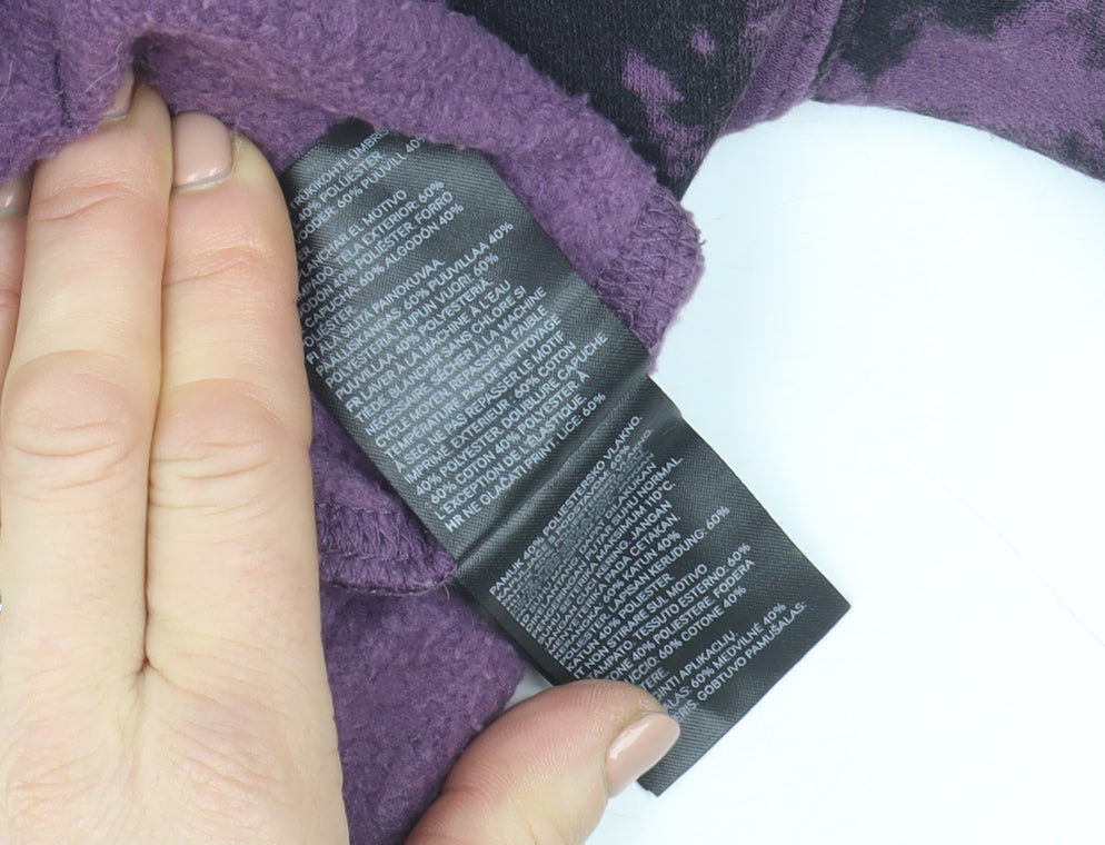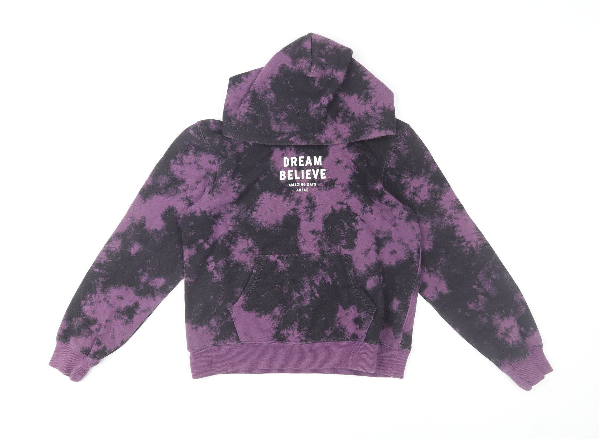 Brighten up everyday casual wear with this trendy H&M Girls Purple Tie Dye Hoodie. Designed for comfort and style, this pullover hoodie is ideal for adding a pop of colour to your little one’s wardrobe. The striking purple and black tie dye effect is perfectly balanced by classic hoodie details, including a large front kangaroo pocket, soft ribbed cuffs, and hem for a snug fit. The inspirational slogan print 'Dream Believe Amazing Days Ahead' adds a positive, fun vibe that’s perfect for school, weekends, or lounging at home. Crafted from a soft and breathable cotton-blend fabric (60% cotton and 40% polyester), the material offers a cosy yet durable finish that holds colour and shape wash after wash. The cosy fleece interior provides warmth during cooler seasons, making it ideal for autumn, winter, and spring wear. With a comfortable regular fit and crew neckline, this hoodie delivers reliable comfort for all-day wear. The pullover design allows for effortless dressing, while the hood adds extra coverage for chillier days. Versatile and practical, this hoodie pairs perfectly with jeans, joggers, or leggings, making it an easy go-to for a casual day out or relaxing at home. Its all-season functionality ensures year-round use, while the machine-washable fabric keeps maintenance simple for busy parents. This is a high-quality piece from H&M, combining fashion-forward colour with everyday ease, ideal for active kids who love stylish comfort. In excellent pre-owned condition, with no visible marks or major signs of wear, this purple tie dye hoodie is a great addition to any girl’s wardrobe. Bring some modern flair and positivity into daily outfits with this comfortable and durable H&M hoodie that’s sure to become a firm favourite.