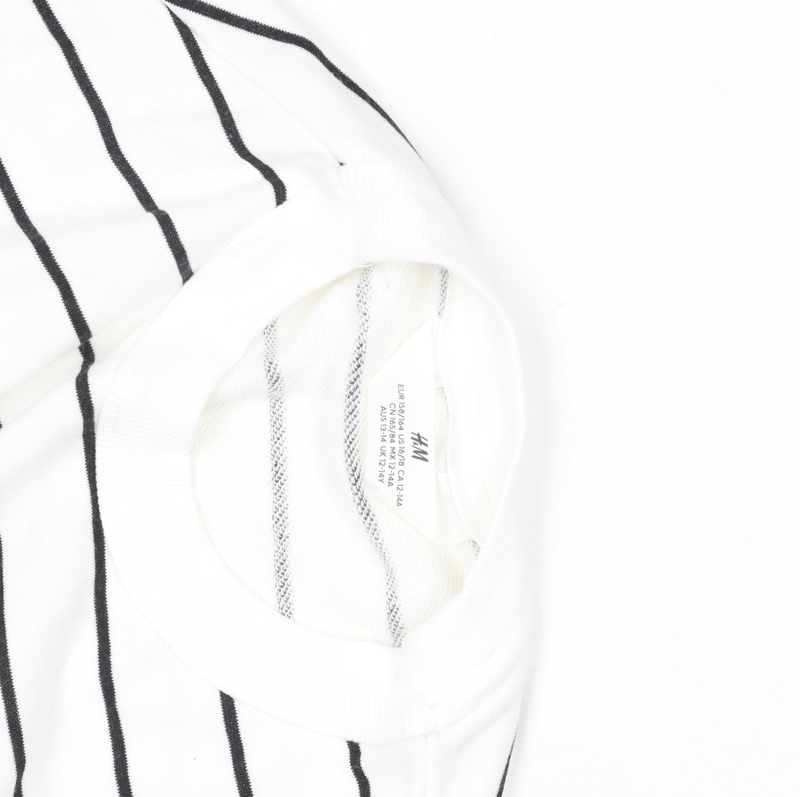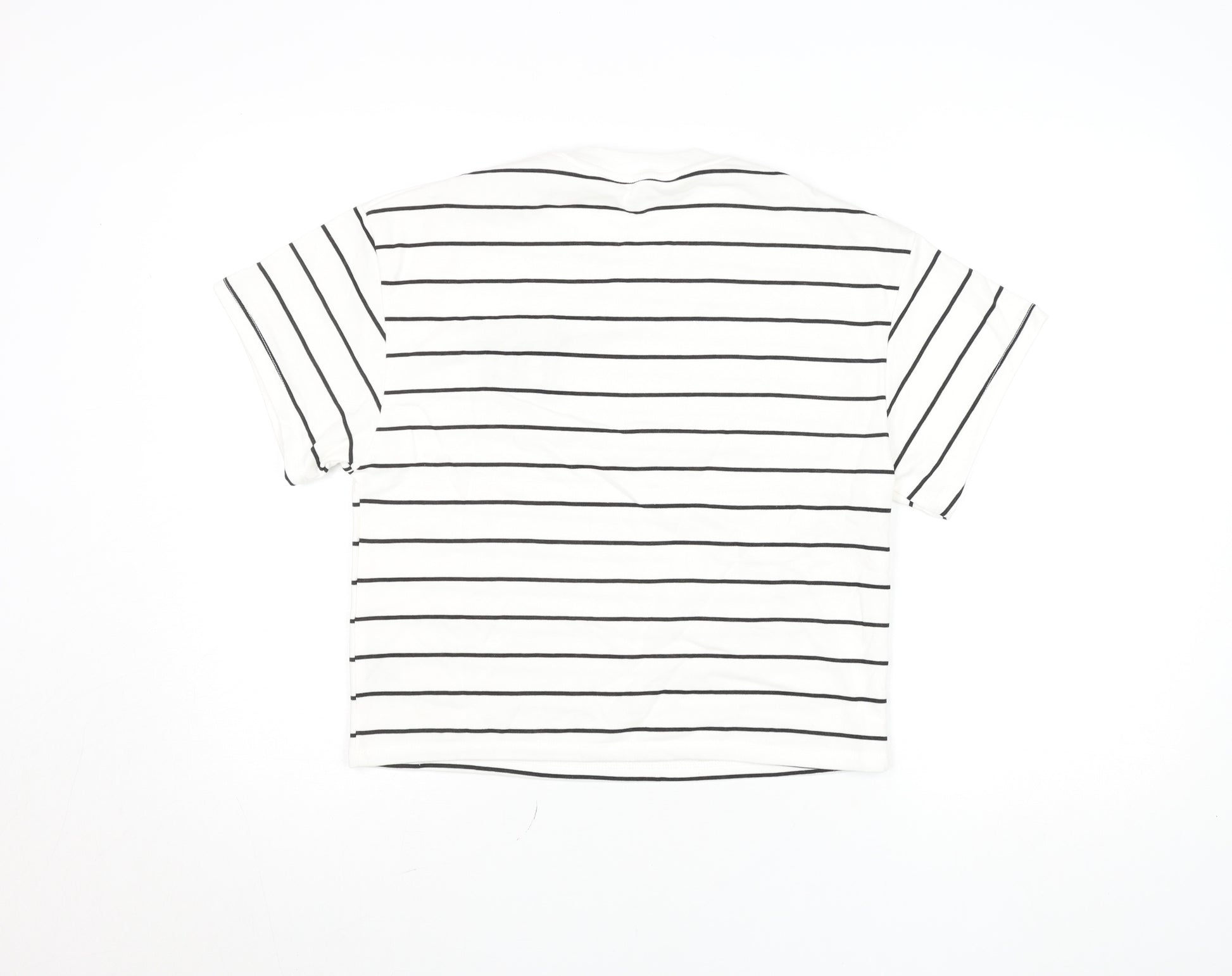Add a stylish staple to your child's wardrobe with this H&M girls’ striped T-shirt, perfect for everyday wear throughout the year. Crafted from a soft cotton and polyester blend, this lightweight and breathable top offers both comfort and durability. The design showcases a crisp white base with sleek black horizontal stripes, giving it a timeless nautical-inspired look. The front features a bold '10' logo accent, adding a sporty and youthful vibe that’s great for active days or casual outings. Designed with a classic crew neckline and regular fit, this short-sleeve T-shirt pairs easily with jeans, shorts, or skirts for effortless style. Its jersey fabric ensures a soft touch against the skin and easy movement, ideal for school days, playdates, or weekend adventures. Suitable for spring, summer, and autumn seasons, it’s also machine washable for hassle-free care, making it a practical choice for busy parents. The piece is in excellent pre-loved condition, showing no stains, fading, or damage, ensuring it looks fresh and ready to wear. Ideal for girls aged 12-13 years, it measures approximately 80 cm across the chest, offering a comfortable and easy fit. The minimal design combined with subtle sporty detailing makes it a versatile top that can transition from weekday wear to leisure settings with ease. Perfect for anyone who loves simple, modern fashion with a touch of character, this H&M girls’ striped T-shirt is a must-have for a stylish everyday look at an affordable price.