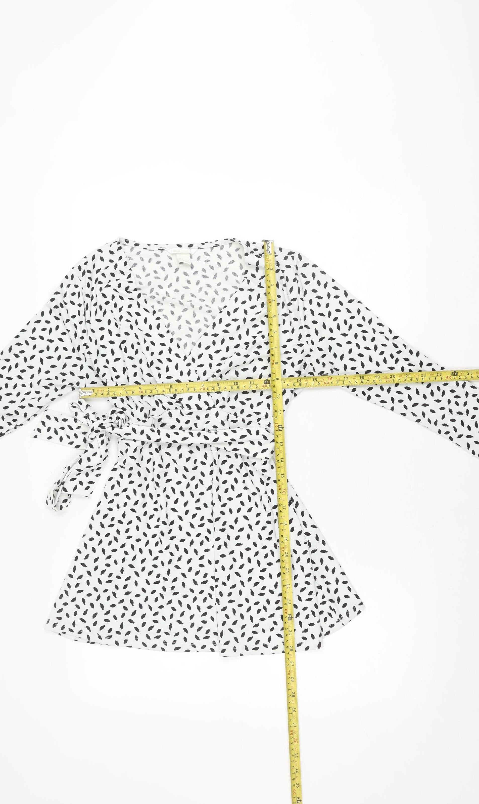 Elevate your maternity wardrobe with this elegant H&M Mama wrap blouse, designed with both comfort and style in mind. Crafted in a lightweight chiffon fabric, this blouse combines a breathable and comfortable wear with a stylish silhouette, ideal for pregnancy. The design features a flattering wrap front with tie closure, allowing you to adjust the fit perfectly around your growing bump while maintaining a chic and contemporary look. With its classic long sleeves and regular fit, this versatile blouse transitions seamlessly from casual day wear to evening outings.The blouse comes in a crisp white colour adorned with black polka dot-style accents, giving it a timeless patterned finish. The V-neckline enhances femininity while allowing easy pairing with camisoles or necklaces for accessorising. The fabric is primarily polyester with added elastane, providing breathable stretch for all-day comfort. Designed as part of H&M's Mama maternity collection, it ensures a fit that supports and adapts during pregnancy without compromising style.Perfect for a variety of occasions, this blouse can be dressed up for a party or cocktail gathering or worn casually with jeans for a laid-back outing. The tie accent not only flatters the waistline but also enhances the blouse's wrap silhouette for a feminine and adjustable finish. Suitable for spring, summer, and autumn, it is ideal for layering or wearing on its own in warmer weather.Condition is excellent, showing light previous wear but no signs of damage or flaws, ensuring it remains a highly desirable wardrobe staple. It is machine washable for easy care, making it a practical and stylish choice for everyday maternity dressing.If you are looking for a maternity blouse that blends comfort, a flattering fit, and timeless style, this H&M Mama piece is a standout option. Pair it with tailored trousers, skirts, or casual denim to experience versatile fashion throughout your pregnancy. A chic yet practical maternity essential that will remain a dependable favourite.