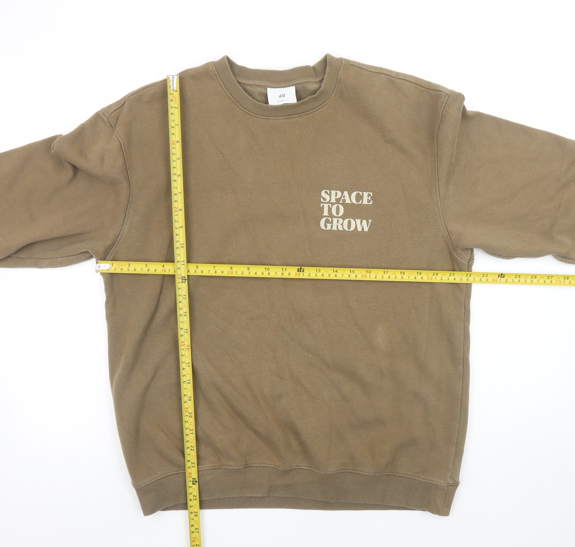 This H&M men’s relaxed fit sweatshirt delivers a stylish yet comfortable everyday look, perfect for layering or wearing on its own. Rendered in a versatile brown shade, it features a bold white printed slogan, 'Space To Grow,' across the back and chest, giving it a modern and thought-provoking edge. Crafted from a soft fleece fabric that blends cotton and polyester, it offers warmth and lasting comfort ideal for autumn, winter, and cooler spring days. The crew neck design and ribbed cuffs and hem promise a comfortable fit that holds its shape while maintaining a casual appeal. Designed with a relaxed fit silhouette, this long-sleeve pullover allows for easy movement and a laid-back profile suitable for everyday wear. Whether you’re lounging, heading out for a coffee, or layering it under a lightweight jacket, this graphic sweatshirt adds a stylish twist to any casual wardrobe. Its durable fleece composition is machine washable, providing easy care for regular use. The bold front and back logos stand out without being overwhelming, symbolising individuality and positivity.Conditioned in very good used state, with only light wear and faint marks consistent with careful use, this timeless piece retains excellent shape and softness. Suited to the modern man or teen who appreciates simple design with expressive detail, it blends effortless comfort with thoughtful messaging. Ideal for layering with jeans, joggers, or casual trousers, this H&M sweatshirt would make a great staple addition to any wardrobe or an appealing gift choice for those who value a minimal yet optimistic aesthetic. A smart option for men seeking quality, comfort, and contemporary style at an affordable price, this H&M Relaxed Fit Sweatshirt delivers excellent value and versatile wear throughout the seasons.