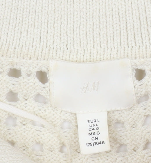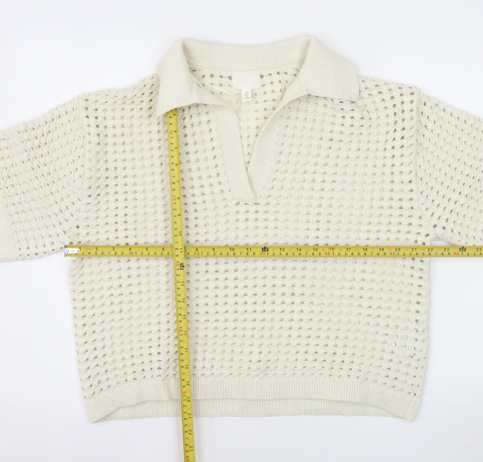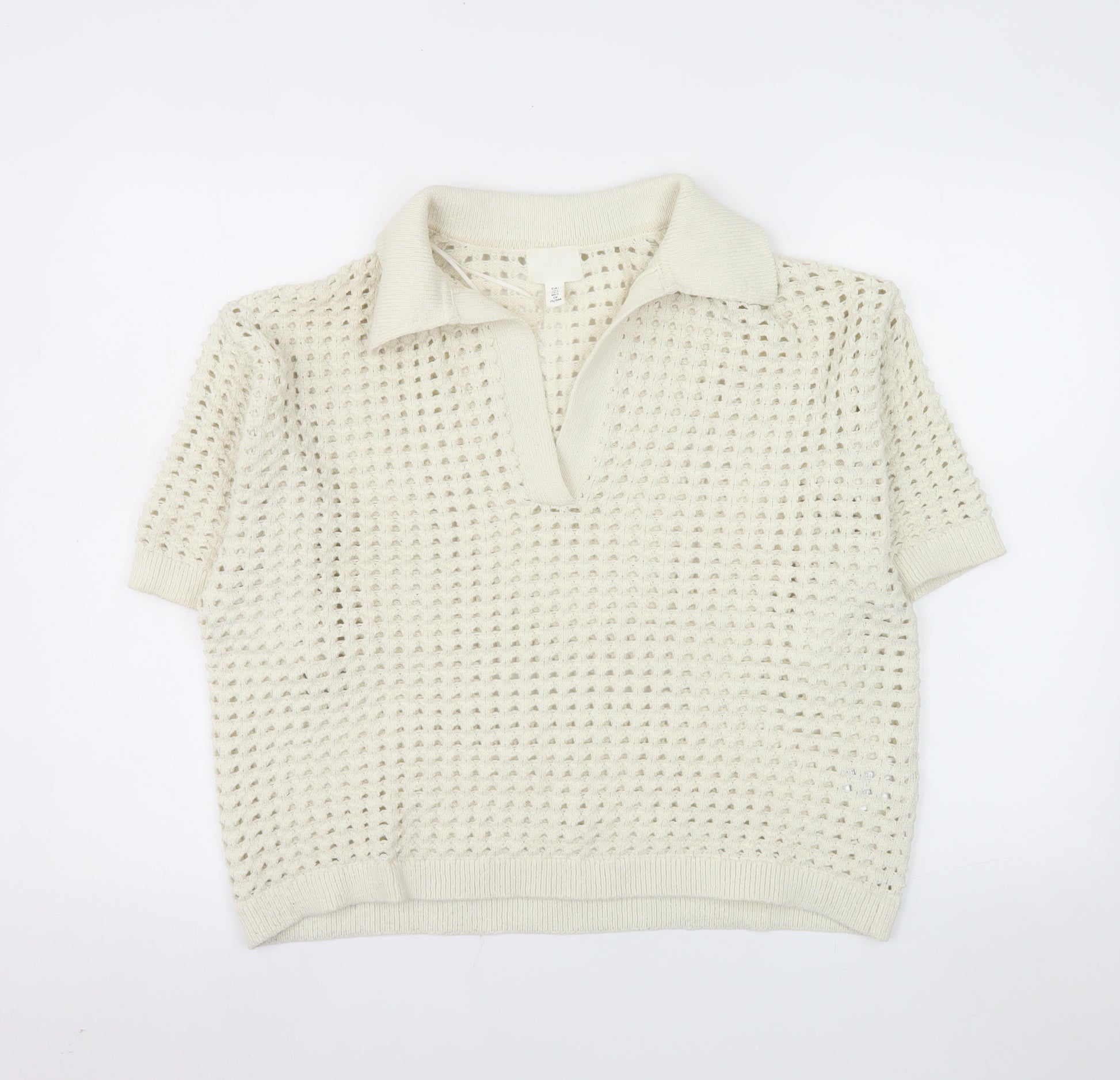 Refresh your wardrobe with this stylish H&M men’s open-knit polo jumper in a sophisticated ivory shade. Crafted from 100% polyester, this lightweight and breathable piece is designed for casual comfort and modern elegance. The open-knit texture gives a contemporary twist to a classic collared design, offering both visual appeal and superior airflow — perfect for warmer months or layering during cooler days.This short-sleeve jumper features ribbed trim at the cuffs and hem for a polished finish, while the soft knit fabric ensures a comfortable fit suitable for all-day wear. The collared neckline with a subtle V-opening adds a relaxed yet refined look, making it easy to style with chinos, jeans, or tailored trousers for a versatile smart-casual appearance.A great staple for spring and summer, this ivory knit offers timeless appeal for fashion-conscious men seeking comfort and sophistication. Whether worn for a relaxed outing, weekday errands, or a weekend lunch, the understated design ensures effortless coordination with your favourite wardrobe pieces.With its breathable construction and excellent pre-owned condition, this H&M jumper blends durability and modern style, promising continued wear and easy maintenance. Machine washable for everyday convenience, it’s a low-maintenance piece that retains its shape and texture wash after wash. Ideal for those who appreciate a subtle yet stylish edge, this jumper embodies simplicity and versatility in equal measure — a must-have for any classic modern wardrobe.