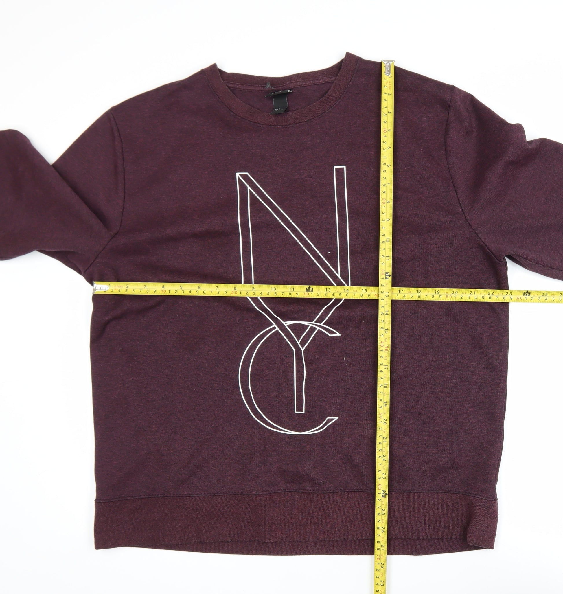 This H&M men’s sweatshirt combines modern streetwear style with casual comfort. Crafted from a soft and durable blend of polyester and cotton, it offers a comfortable fit that’s ideal for everyday wear. The rich purple shade adds sophistication, while the bold white 'NYC' graphic across the chest gives it an urban edge that makes it perfect for both relaxed days and stylish outings. Designed in a classic pullover crew neck style, this sweatshirt provides ease of wear and timeless appeal. The regular fit ensures it flatters most body types without being too tight or baggy. The long sleeves and ribbed cuffs enhance comfort while keeping warmth in during cooler weather, making it ideal for autumn, spring, and winter seasons. With its lightweight yet sturdy jersey fabric, the sweatshirt maintains breathability and flexibility, allowing freedom of movement throughout the day. Versatile enough to pair with jeans, joggers, or layered under a jacket, this sweatshirt is a wardrobe staple for those who appreciate both comfort and modern fashion. The front logo accent reinforces its laid-back, city-inspired aesthetic, while the machine-washable material ensures easy care and lasting quality. Though pre-owned, it remains in excellent condition with minimal signs of wear, showing no stains, holes, or significant fabric fading. Ideal for men seeking casual style with an urban twist, this H&M NYC graphic sweatshirt is an effortless addition to any contemporary wardrobe. Comfortable, versatile, and stylish, it reflects the perfect blend of practicality and fashion appeal — a must-have piece for those who want their everyday wear to look as good as it feels.