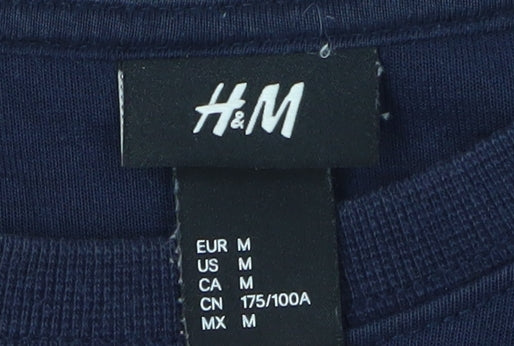 Enhance your casual wardrobe with this H&M Men's Blue Graphic Print Pullover Sweatshirt, perfect for that laid-back yet stylish look. Crafted from a cosy blend of 60% cotton and 40% polyester, this sweatshirt offers a soft fleece texture that ensures comfort and warmth. Featuring a classic crew neckline and long sleeves, it's designed to provide a relaxed and comfortable fit, ideal for brisk autumn and spring days. The striking graphic print on the front adds a touch of contemporary style, making it a versatile choice for everyday wear or weekend outings. Its lightweight nature makes it easy to layer, providing flexible styling options. This regular fit pullover belongs to the Casual Theme collection and is machine washable, promising ease of care. In excellent condition with no visible flaws, it's ready to become a staple in your wardrobe. Elevate your fashion game with this must-have sweatshirt at an unbeatable price.