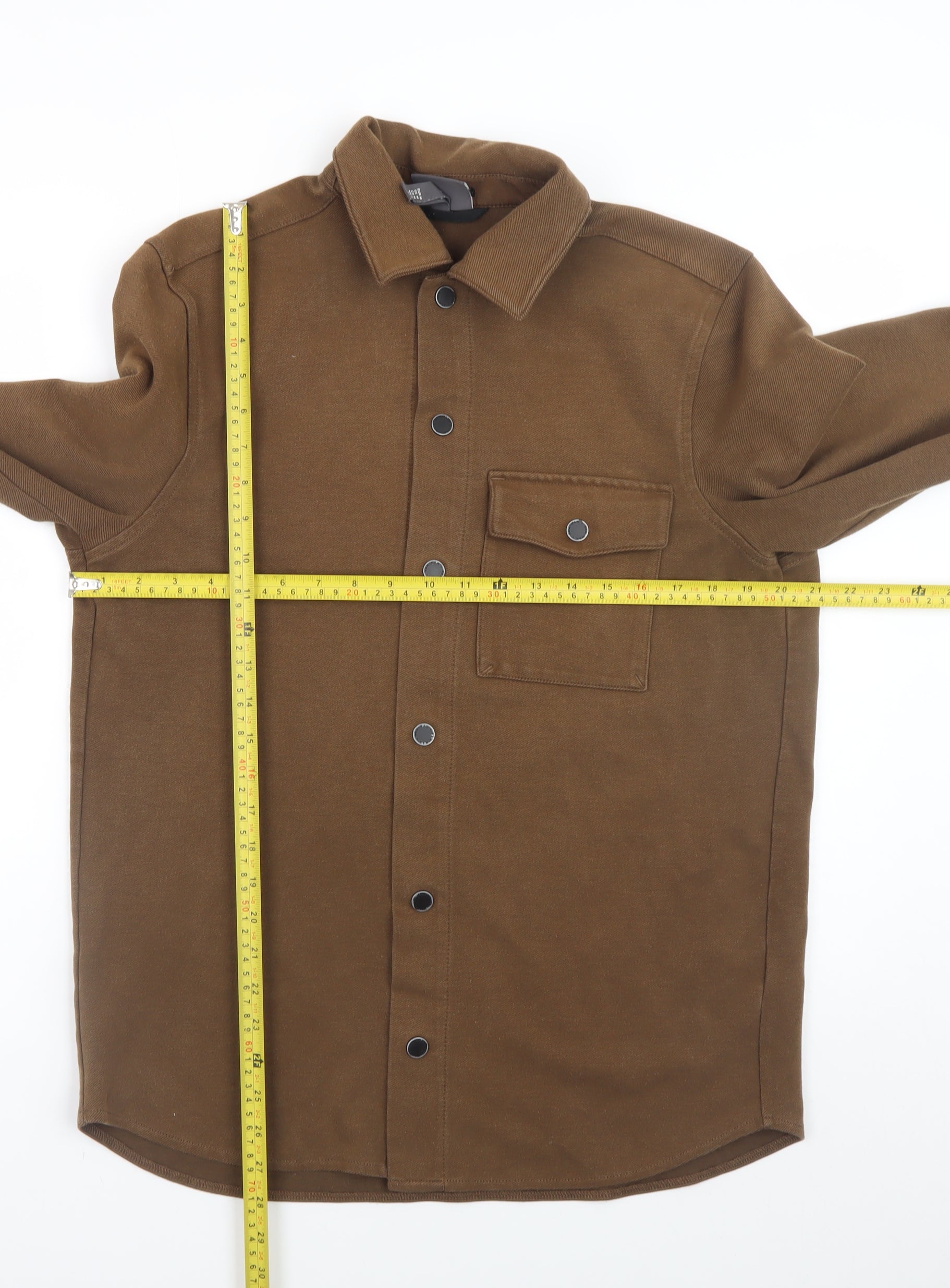 This H&M men’s brown twill jacket is a stylish and versatile piece designed for the modern wardrobe. Crafted from a durable fabric blend of 53% polyester, 44% cotton, and 3% elastane, it offers a comfortable feel with a slight stretch for ease of movement. The rich brown colour gives it a timeless appeal, perfect for pairing with jeans, chinos, or more tailored trousers. Designed in a regular fit, it provides a flattering silhouette without being restrictive, making it suitable for casual outings or layering during transitional seasons. Featuring a classic collared neckline and snap button closure, this jacket combines practicality with everyday style. A single chest pocket adds a subtle utility detail, contributing to its structured yet relaxed aesthetic. The mid-length cut and lined interior enhance overall comfort and wearability across autumn and spring seasons. Ideal for casual wear, this piece can be effortlessly styled over shirts, jumpers, or t-shirts to create a refined yet laid-back ensemble. The snap button fastening adds convenience, while the robust stitching ensures longevity and shape retention even with regular use. Machine washable for easy maintenance, this jacket is a great addition for anyone seeking an everyday essential that blends ease with polish. Although pre-loved, it remains in excellent condition with only minimal signs of gentle wear and no visible flaws or damage. A high-quality timeless piece from H&M, this jacket is a great value buy that bridges comfort, functionality, and style seamlessly—ideal for those who appreciate versatile outerwear pieces suited for all casual occasions.