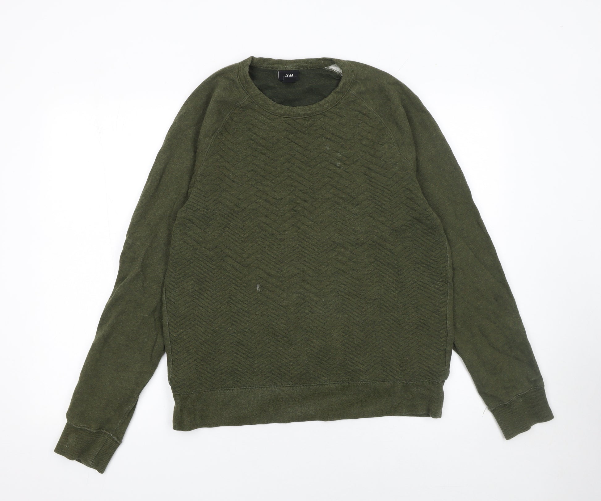 Add a touch of casual comfort to your wardrobe with this H&M men’s green pullover sweatshirt. Designed in a classic crew neck style, this sweatshirt combines simplicity with subtle texture thanks to its geometric herringbone knit front pattern. Crafted from a soft yet durable cotton polyester blend, it provides breathable comfort that’s ideal for everyday wear across multiple seasons. With its lightweight construction and regular fit, it’s perfect layered over a t-shirt for cooler days or worn on its own for laid-back style. The sweatshirt is expertly finished with ribbed cuffs and hem to maintain its shape and ensure a comfortable fit throughout the day. Its understated army green colour makes it versatile enough to pair effortlessly with jeans, chinos or joggers for a relaxed, yet stylish look suitable for work-from-home comfort, casual outings or weekend downtime. Made from 63% cotton and 37% polyester, it offers easy maintenance and is machine washable, keeping it a practical option for regular use. Though pre-loved, it remains in good wearable condition, showing only light signs of use with a small mark on the front. This H&M sweatshirt has retained its colour and shape, providing fantastic value for a piece that blends comfort and everyday fashion appeal. Ideal for men who appreciate minimalist design with subtle detailing, it’s an easy choice for those looking for a dependable, all-seasons sweatshirt that delivers both style and practicality. Whether you’re heading out for a casual day or lounging indoors, this pullover offers reliable wear and timeless appeal. Get the look you love with this comfortable, high-quality H&M sweatshirt that fits seamlessly into any modern wardrobe.
