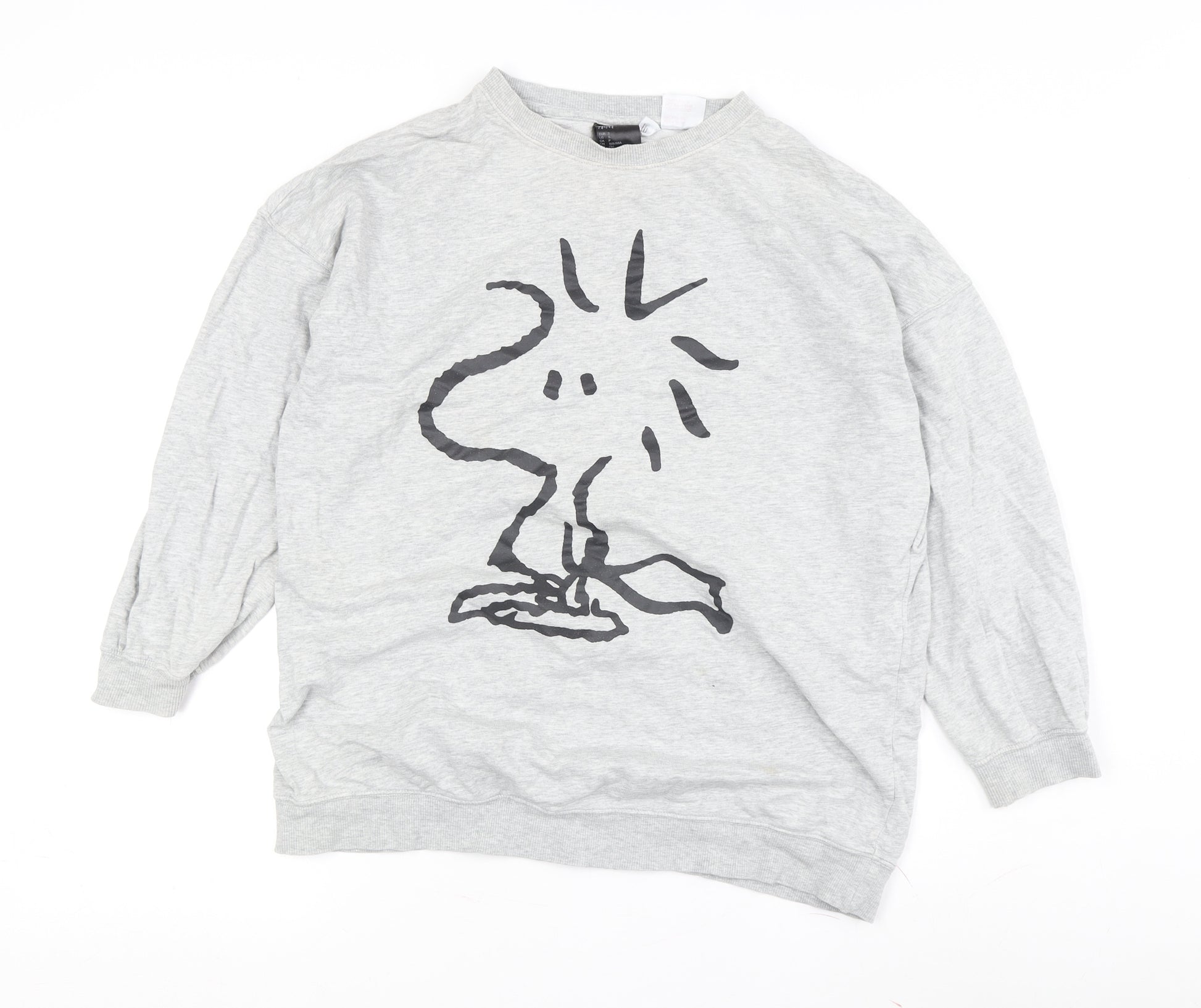 Embrace nostalgic style with this charming grey pullover sweatshirt from H&M, featuring an iconic Peanuts graphic print. With a relaxed fit and crafted from 100% cotton jersey, this long-sleeve sweatshirt offers both comfort and a casual look. Perfect for any unisex adult, the sweatshirt sports a simple crew neckline, making it easy to pair with your favorite jeans or leggings. Despite a small hole, it's ideal for cosy casual wear, offering a perfect blend of style and nostalgia for Peanuts fans of all ages. Great for relaxed days, this cartoon-themed sweatshirt effortlessly brings a touch of whimsy to your wardrobe. Machine washable for easy care, it’s designed to keep you snug and stylish with minimal effort.