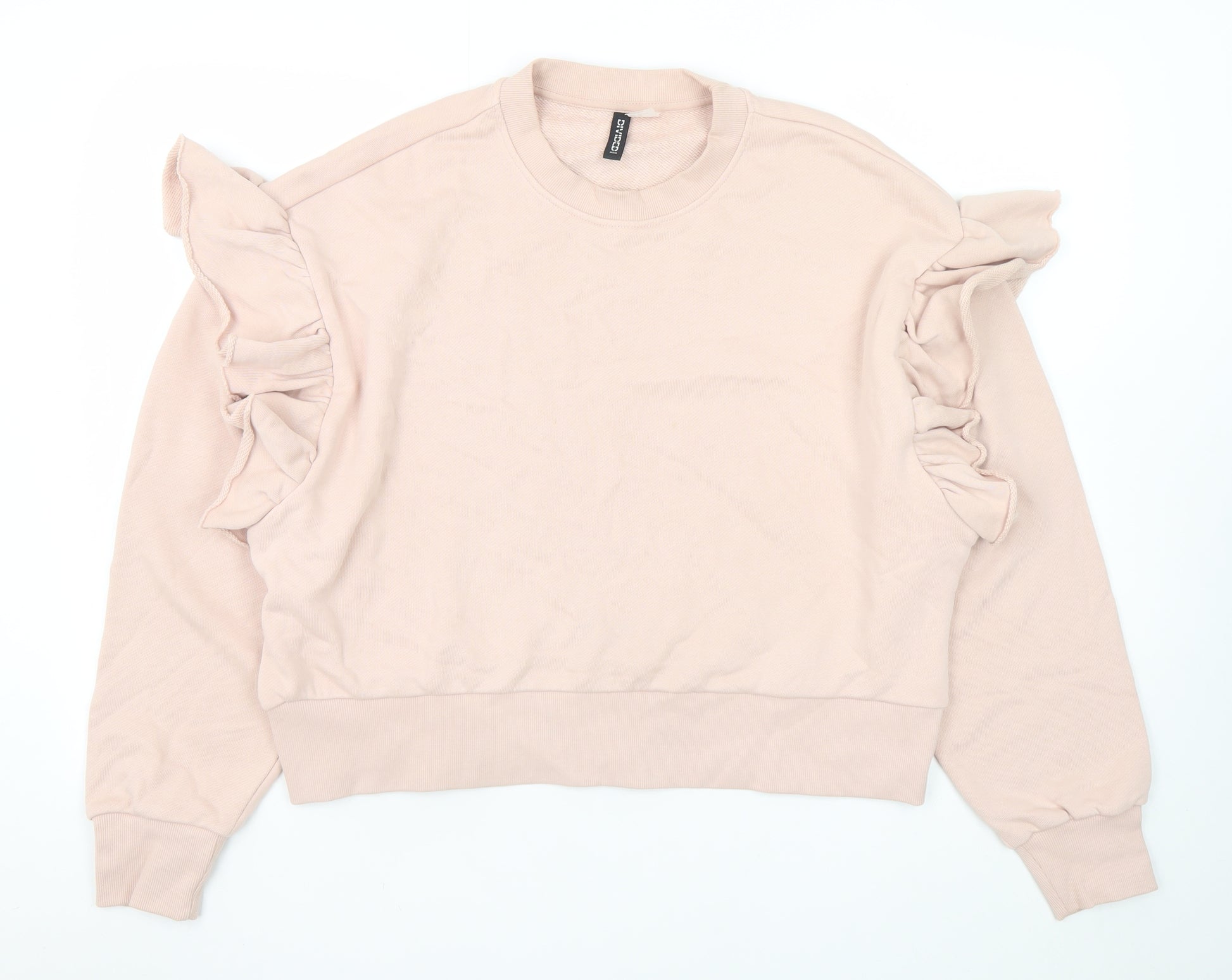 Elevate your casual wardrobe with this feminine and stylish H&M women’s sweatshirt in a soft beige tone. Designed in a relaxed pullover style, this cosy piece blends comfort and flair effortlessly. Made from 100% cotton, it offers natural breathability, softness, and durability—perfect for all seasons. The crew neckline and ribbed cuffs and hem add a classic casual edge, while the standout ruffle accents along the shoulders add a playful, fashion-forward twist. This versatile sweatshirt can easily be dressed up or down. Pair it with jeans and trainers for effortless weekend styling or layer it over a collared shirt for a chic everyday look. The lightweight cotton fabric makes it easy to wear year-round, providing comfort without compromising on style. In excellent pre-loved condition, this sweatshirt shows minimal signs of wear, maintaining its quality and structure beautifully. Ideal for women or teens who love soft tones and feminine touches in their casualwear, this neutral beige colour complements any wardrobe. Whether you’re heading out for brunch, relaxing at home or running errands, this pullover adds comfort and polish to your outfit. A fashionable yet easygoing essential from H&M that embodies modern simplicity with a hint of charm. Add this ruffled beige pullover to your collection today and enjoy the perfect blend of softness, subtlety, and stylish detailing—ideal for women who appreciate comfort with a contemporary edge.
