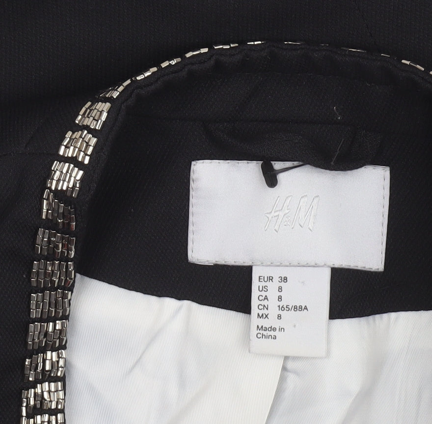 Add a touch of sophisticated glamour to your wardrobe with this stunning H&M women's black blazer. Expertly cut in a regular fit, this elegant jacket is designed to elevate any outfit — from office wear to evening events. The deep black woven fabric offers a smooth, structured shape while the striking beaded embellishment along the open front adds a distinctive, eye-catching appeal. Crafted from a quality blend of 67% polyester, 30% viscose, and 3% elastane, the blazer provides both durability and comfort with a subtle stretch for a flattering fit. The interior is fully lined with a soft combination of polyester and viscose, ensuring a smooth silhouette and refined finish.This single-breasted, open-front design features long sleeves and a notch lapel cut that flatters the neckline, making it suitable for both formal and semi-formal occasions. Perfect for pairing with tailored trousers or a sleek skirt, it transitions seamlessly from daytime business attire to evening elegance. Wear it over a crisp blouse for a professional statement or style it with dark jeans and heels for a chic, modern look.Ideal for autumn, winter, or cooler spring evenings, this versatile black blazer is a wardrobe essential that combines contemporary tailoring with a glamorous twist. The lined construction, embellished trim, and expert tailoring make it a standout piece for workwear, cocktail parties, or special events. Designed by H&M, this polished blazer embodies affordable luxury and versatile fashion suitable for confident modern women.In excellent pre-owned condition with no visible damage or flaws, it’s ready to wear and impress. Style that lasts, elegance that shows — this H&M black beaded blazer is a must-have for those who appreciate timeless sophistication with a hint of sparkle.