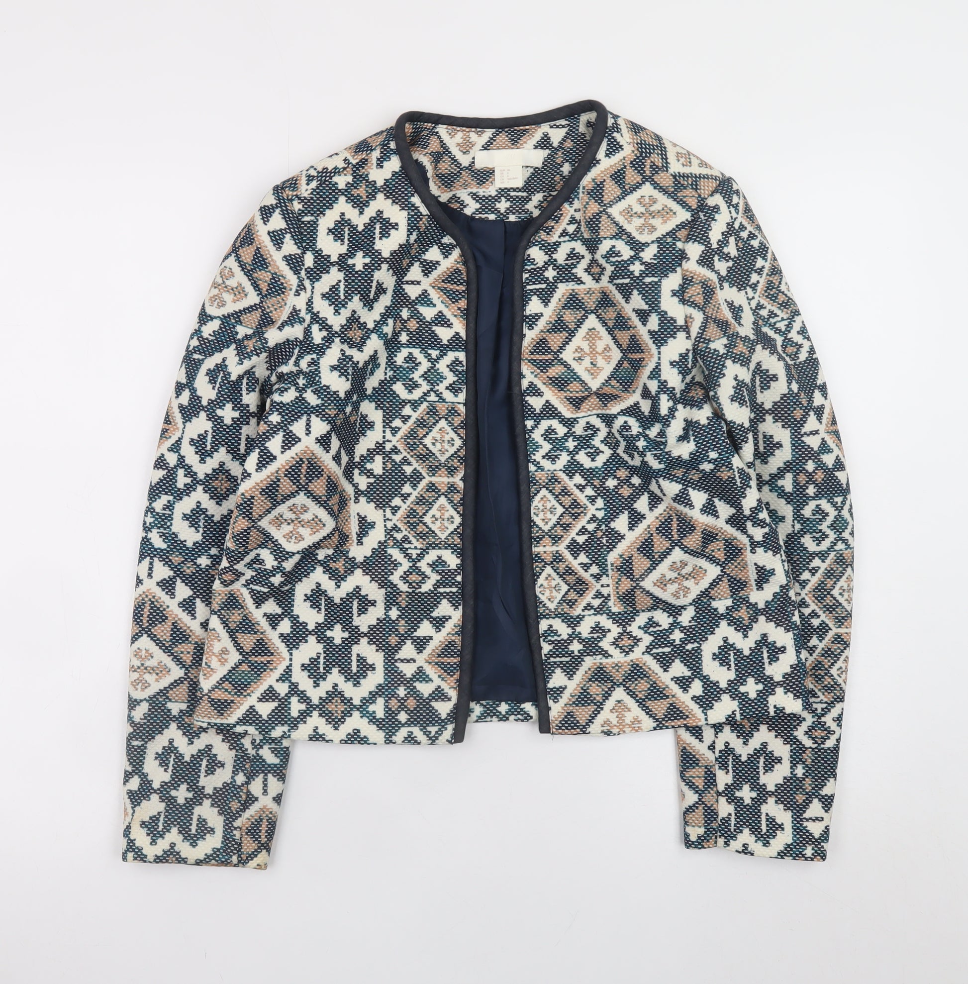 Elevate your wardrobe with this stylish H&M Women’s Blue Geometric Blazer Jacket in size 8, blending classic tailoring with a modern, eye-catching woven design. Crafted from a durable and comfortable blend of polyester and elastane, this beautifully structured jacket offers a lightweight and flexible fit. Fully lined in smooth polyester, it feels soft against the skin while maintaining a polished silhouette that's perfect for layering over tops, blouses, or dresses. The intricate geometric pattern in blue, beige, and ivory tones adds a touch of sophistication and contemporary appeal, making it an ideal piece for both casual and smart-casual settings. Its open-front design gives it a relaxed, yet refined look, great for workdays, dinners, or weekend outings. The round neckline and neat, structured shoulders create a flattering fit for everyday wear. Perfect for spring or autumn, this versatile short jacket complements a wide range of outfits – pair it with tailored trousers for business meetings or jeans for a polished off-duty look. The material blend ensures comfort and ease of movement while retaining shape, making it a practical yet stylish choice for modern wardrobes. While pre-loved, this H&M blazer remains in excellent condition with no visible marks or damage, ready to add a refined touch to your collection. If you're after a chic layer that transitions seamlessly between seasons and occasions, this timeless geometric blazer is sure to impress — effortless, elegant, and distinctly modern. Whether heading to the office or out for brunch, this piece is your go-to for understated sophistication.