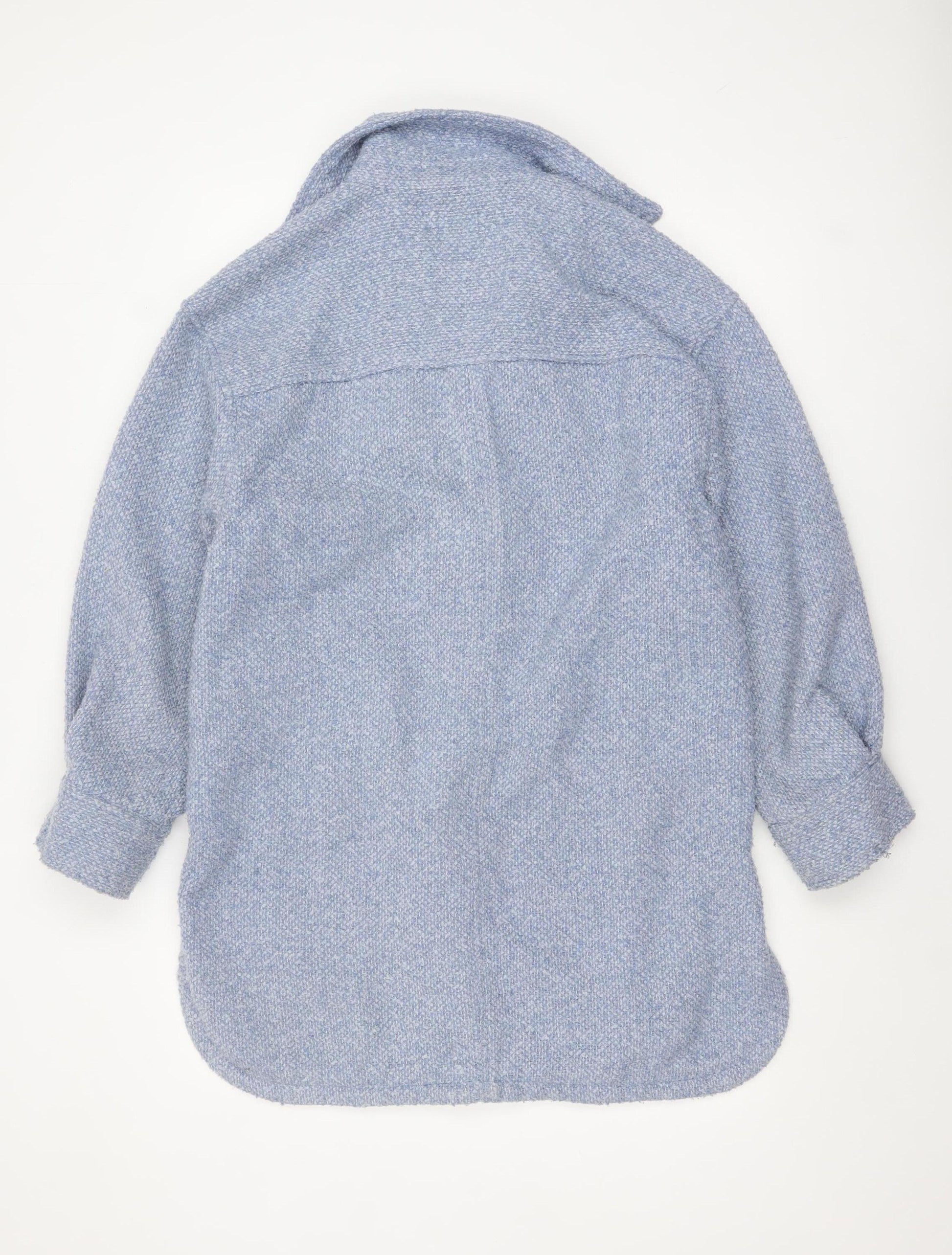 This stylish H&M women’s blue mid-length shacket jacket offers a perfect blend of comfort and casual elegance. Made from soft 100% polyester in a woven tweed-like texture, it provides warmth and durability without feeling heavy. Its design features a relaxed, regular fit with full-length sleeves and a button closure down the front. The shirt-style collar and flap chest pockets add a touch of structure to the otherwise soft silhouette, making it both timeless and practical. The classic button accents and subtle mid-length cut make it easy to layer over a jumper in colder months or wear on its own during mild spring days. The pale blue tone complements both neutral and denim pairings for effortless everyday styling. Lined in smooth polyester for comfort, it’s crafted with care and designed for versatility, ideal for wearing across multiple seasons. The polyester construction ensures the jacket remains easy to care for and stays resistant to creasing, while the machine-washable fabric means no expense on dry cleaning. Perfect for casual outings, travel, or everyday wear, this shacket-style jacket will enhance any wardrobe with its understated sophistication and comfortable fit. In excellent pre-loved condition with only very light wear noted, it shows no visible marks, stains or damage. It’s ready for immediate wear and adds an edge of effortless chic to any outfit. A great buy for anyone looking to expand their outerwear collection with a practical yet fashionable piece that works throughout the seasons, blending the relaxed appeal of a shirt with the coverage of a light jacket. An ideal lightweight layer for daytime errands, weekend getaways or transitional weather, offering style, warmth and comfort in equal measure.