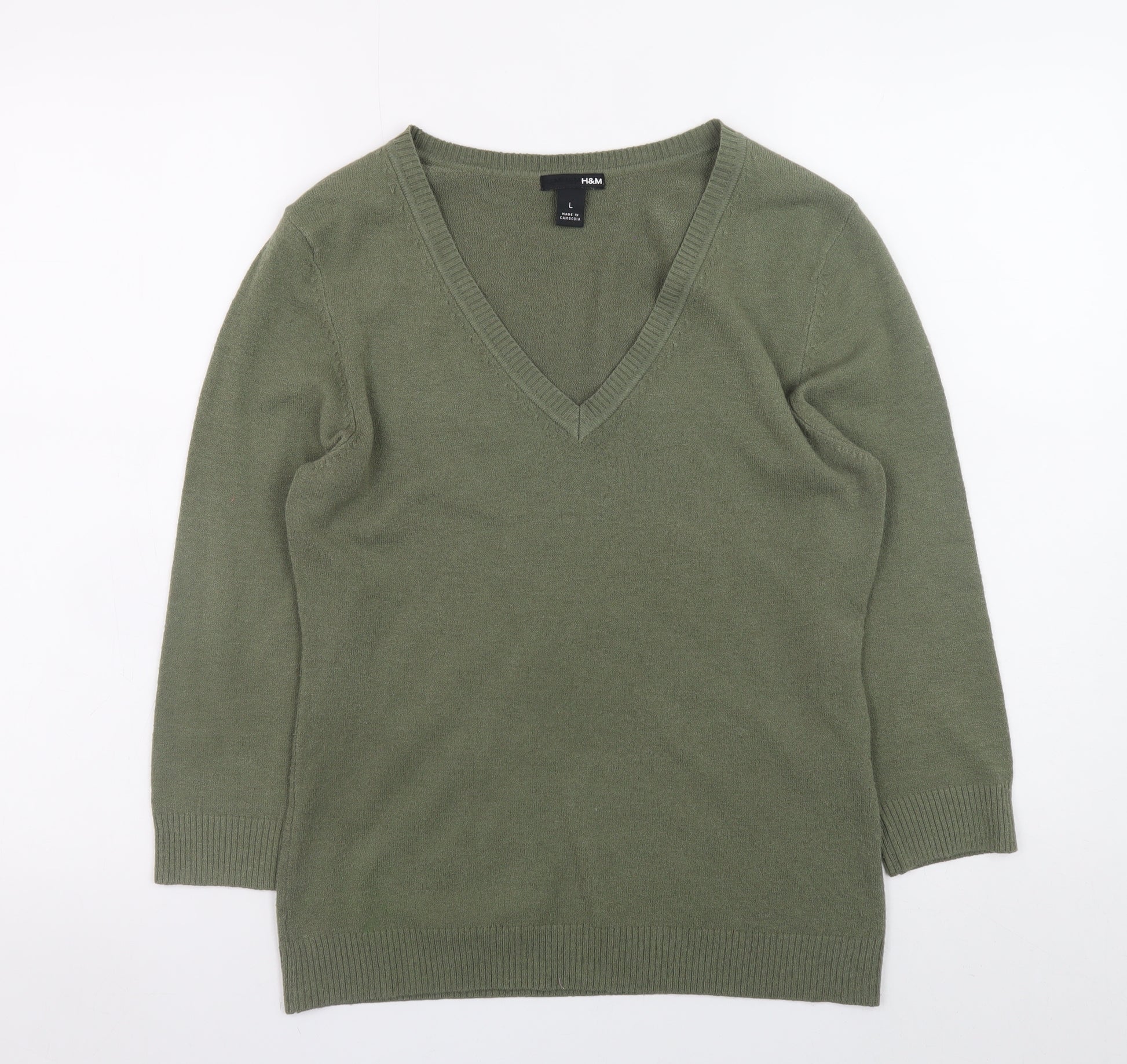 This stylish women’s H&M V-neck jumper is an elegant wardrobe essential perfect for effortless everyday wear. Crafted in a flattering shade of green, this versatile pullover is designed with a comfortable regular fit, offering an easy yet polished look. The three-quarter length sleeves add a modern twist to a timeless silhouette, ideal for layering across multiple seasons including autumn, spring, and even mild winter days. Made from a soft and lightweight knit blend of 70% acrylic and 30% polyamide, it provides warmth without bulk, ensuring all-day comfort while maintaining a smooth touch. The fine tight-knit fabric offers just the right amount of stretch for flexibility and shape retention. Its simple V-neckline enhances its classic femininity, making it easy to pair with shirts, camisoles, or scarves for an adaptable outfit choice. Perfect for casual occasions, this jumper teams beautifully with jeans for a laid-back weekend look or can be styled with tailored trousers for a smart-casual office outfit. The ribbed hem and cuffs provide structure and a neat finish to the design, while the lightweight material makes it an excellent layering piece under jackets or over collared shirts. This jumper remains in excellent pre-owned condition with light general wear and no visible damage. It’s machine washable for easy care, keeping maintenance simple and practical. Whether you’re unwinding at home, heading to work, or stepping out for a relaxed lunch date, this H&M green V-neck pullover is a dependable addition to any wardrobe—chic, comfortable, and ready to wear. Its effortless design and soft finish make it a go-to piece that pairs beautifully with everything from jeans and boots to skirts and flats. Revitalise your knitwear collection with this understated yet stylish essential that perfectly blends comfort and modern simplicity.