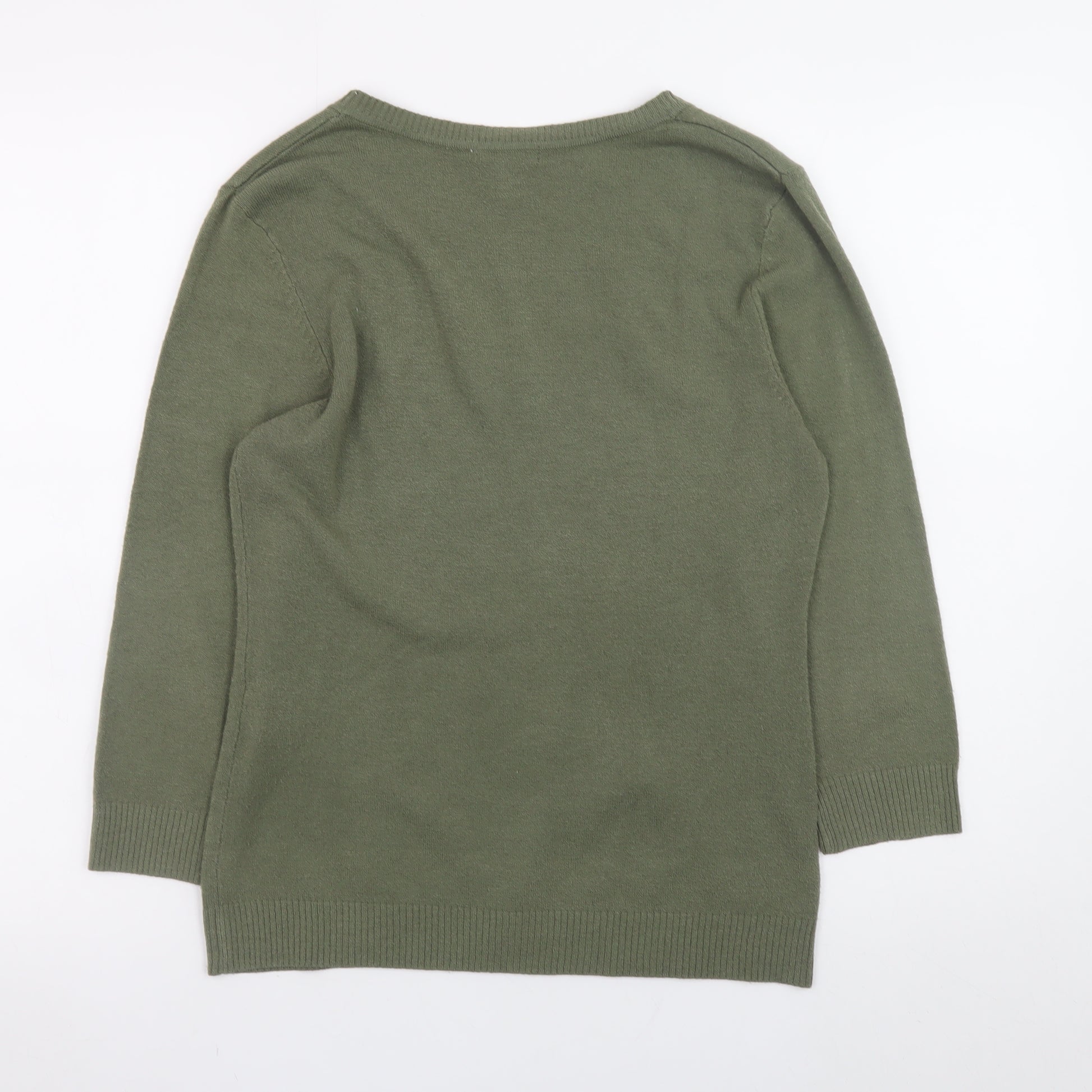 Women Green V-Neck 3/4 Sleeve Pullover Jumper Size L