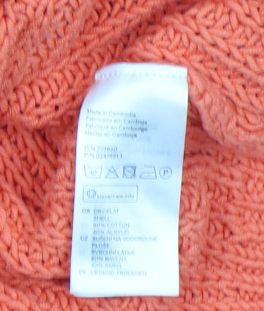 Brighten your wardrobe with this beautiful orange cable knit jumper from H&M, designed for comfort and modern casual style. Made from a soft and breathable blend of 60% cotton and 40% acrylic, this jumper offers lightweight warmth while remaining easy to care for. The relaxed fit ensures a comfortable silhouette suitable for everyday wear, and the medium thickness knit makes it perfect for layering throughout the autumn, spring, and winter seasons. Featuring a crew neckline and stylish cable-knit detailing down the front, it delivers a timeless appeal that effortlessly pairs with jeans, skirts, or trousers. The rib-knit cuffs, hem, and neckline add texture and structure to the overall look, while the 3/4 length sleeves bring an airy touch to the otherwise cosy design. This jumper is ideal for casual occasions, from relaxed weekend outings to cosy evenings indoors. The vibrant orange hue adds a cheerful pop of colour, elevating any outfit with just the right amount of brightness. Offering the dependable quality H&M is known for, this piece remains in excellent pre-owned condition with no visible flaws and has been lightly worn, maintaining its shape and softness. A versatile essential for any woman’s wardrobe, perfect for those seeking a mix of contemporary fashion and easy wearability. Machine washable for your convenience, this jumper provides effortless maintenance while ensuring lasting wear. Whether styled alone or as part of a layered look, it’s a wonderful staple that combines everyday utility with understated charm. Secure your new favourite jumper today and enjoy the warmth, comfort, and uncomplicated elegance it brings to your collection.