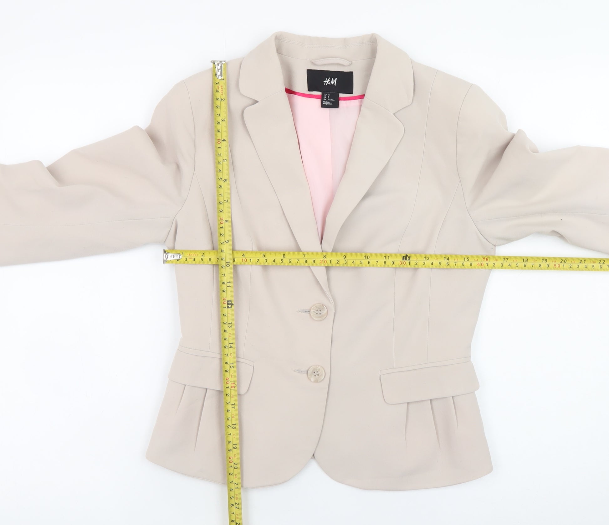 This elegant beige H&M Women’s Blazer, sized UK 10, is a sophisticated and versatile piece that brings polish to any outfit. Crafted from a blend of polyester, viscose, and elastane, the jacket offers a comfortable stretch fit while maintaining its structured form. The twill fabric and light pink polyester lining complement its feminine yet professional style. Featuring a classic two-button single-breasted front, notched collar, long sleeves, and flap pockets, it combines practicality with timeless elegance. Designed for women who value style and comfort, this chic blazer is perfect for business meetings, office wear, or smart casual outings. The fitted cut enhances the silhouette, making it flattering whether worn over a blouse, a shift dress, or a fine knit jumper. Its neutral beige tone ensures it pairs seamlessly with most colours, from traditional blacks and greys to soft pastels or denim, making it a flexible wardrobe essential. The lining ensures all-day comfort, while subtle pleat details add a touch of character without overwhelming the clean aesthetic. This jacket is ideal for spring and autumn layering when lightweight yet structured tailoring is required. In excellent, gently worn condition with no visible flaws or signs of heavy use, it has been well maintained and remains ready to wear. Machine washable for easy care, this H&M blazer offers a smart, affordable way to elevate any outfit with classic appeal and contemporary ease. It’s a must-have jacket for any modern woman’s collection, bringing effortless sophistication to workwear, dinner engagements, and casual chic looks alike.