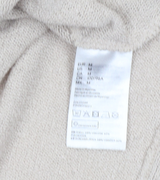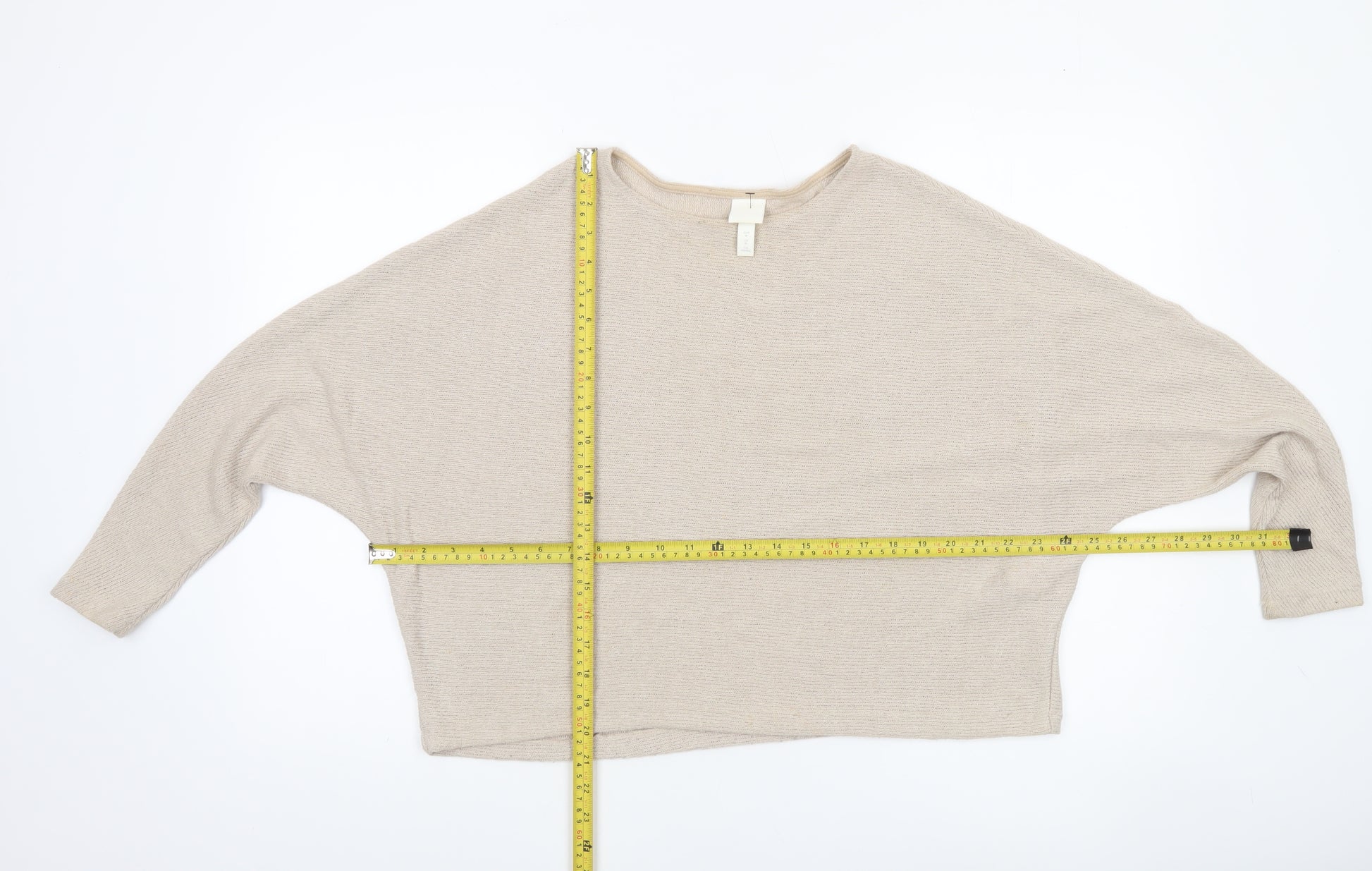 Elevate your casual wardrobe with this effortlessly stylish H&M Women’s Beige Knit Jumper. Crafted from a soft blend of viscose and polyamide, this lightweight pullover offers both comfort and elegance in equal measure. The relaxed fit and dolman-style long sleeves provide easy movement and a contemporary silhouette that flatters all body shapes. Perfect for layering or wearing solo, it’s an ideal choice for autumn, winter, and early spring wear. This jumper comes in a soft beige shade that pairs beautifully with jeans, skirts, or tailored trousers for a timeless, minimalist look. The boat neckline adds a touch of sophistication, while the tight-knit construction ensures subtle warmth without bulk, making it a versatile piece suitable for multiple occasions—from relaxed afternoon outings to cozy evenings indoors. H&M’s attention to detail is evident in the high-quality knit and comfortable finish, creating a refined yet casual look ideal for modern wardrobes. The fabric composition of 80% viscose and 20% polyamide ensures durability, softness, and ease of care, allowing for machine washing without losing shape or texture. Designed for women who appreciate simple elegance, this jumper is both easy to style and endlessly wearable. Pair it with slim-fit jeans and ankle boots for a casual chic appearance, or layer under a leather jacket for an edgier aesthetic. Lightweight and breathable, it’s an all-season essential that can transition seamlessly from day to night. This piece remains in excellent condition, exhibiting only light signs of previous wear while maintaining its overall quality and charm. With its blend of comfort, style, and versatility, this jumper will quickly become one of your favourite wardrobe staples. A brilliant find for those who love classic knitwear with an understated touch of sophistication.
