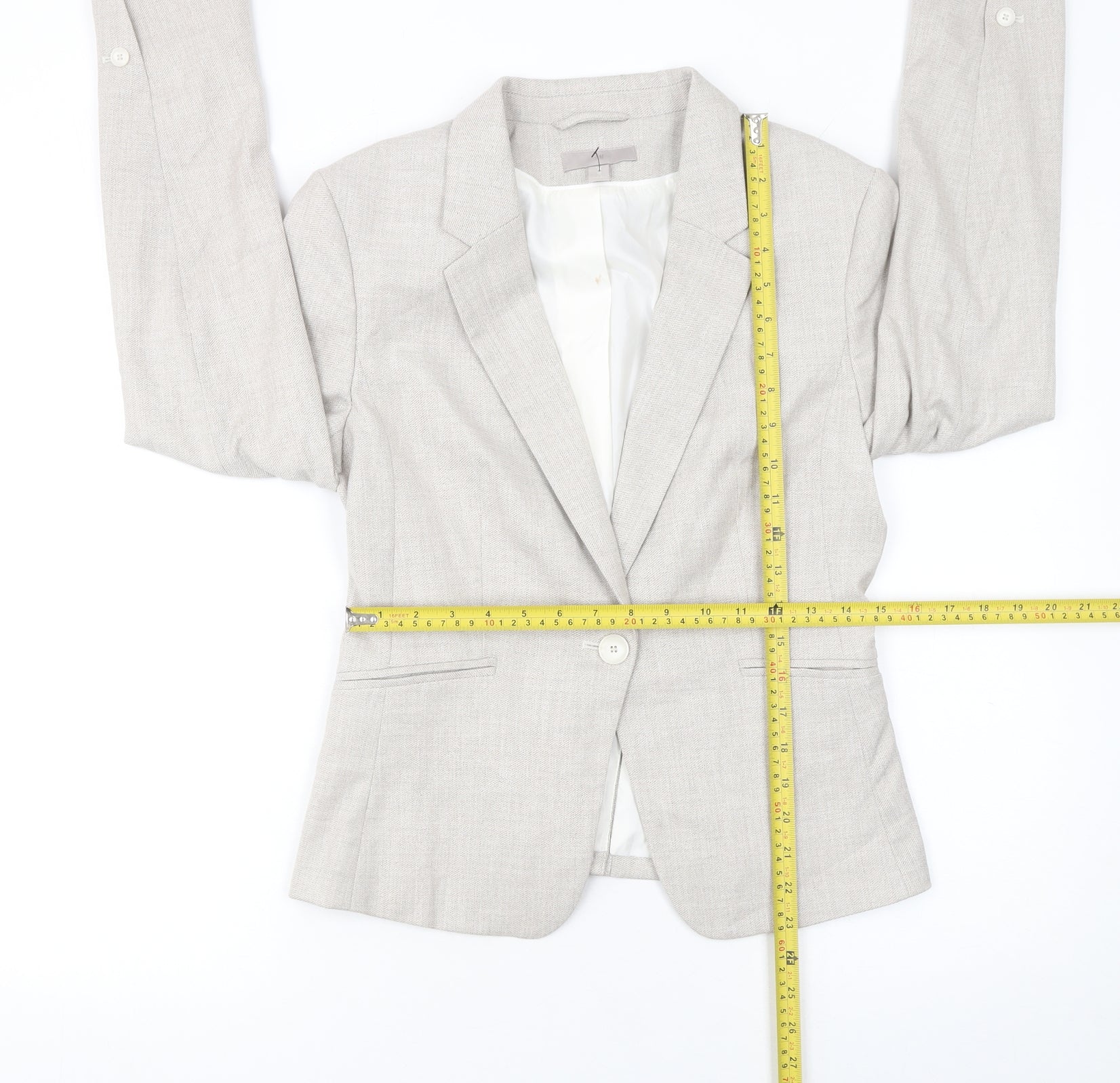 Achieve a polished and professional look with this H&M Women’s Beige Tailored Blazer in size UK 10. Crafted from a refined woven blend of polyester, viscose, and a touch of elastane, this blazer offers both structure and comfort, ensuring a flattering fit for any occasion. Its single-breasted silhouette with a one-button front closure and notch lapels exudes timeless sophistication, while the regular length and long sleeves make it ideal for year-round wear. The fully lined interior enhances comfort and provides a smooth, professional finish. The neutral beige colour adds versatility, easily coordinating with trousers, skirts, or dresses for business meetings, formal events, or smart-casual outings. Designed with fine tailoring details such as welt pockets and a lightly structured shoulder line, this piece brings effortless polish to any wardrobe. The fabric’s subtle texture gives it a modern yet classic appearance suitable for workwear or special occasions. This blazer’s lightweight, lined construction makes it perfect for spring through autumn, offering breathability without compromising on elegance. Although pre-owned, the blazer remains in good condition, showing only minimal signs of wear including a light stain on the lining. Ideal for those seeking affordable sophistication, this piece blends practicality with timeless design. Pair it with matching trousers for a professional look, or dress it down with jeans for a chic, off-duty ensemble. With its quality construction and enduring style, this H&M blazer is a reliable staple for any contemporary wardrobe. Perfect for business, workwear, or formal occasions, its understated colour and classic tailoring will keep you looking effortlessly composed all day long.