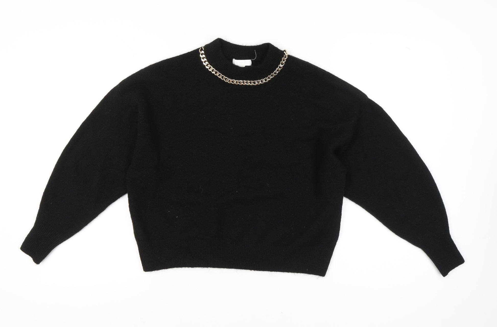 Add effortless style and comfort to your wardrobe with this chic H&M women’s pullover jumper. Crafted in a timeless black colour, this knit jumper features a flattering crew neckline adorned with a gold-tone chain accent for a touch of modern elegance. Designed with long sleeves and a regular fit, it offers warmth and versatility, making it a great choice for casual, everyday wear throughout the autumn and winter seasons.Made from a lightweight yet durable polyester knit, this jumper provides a smooth, soft texture against the skin while ensuring ease of movement and comfort. The tight-knit fabric delivers a sleek finish without any visible pattern, allowing it to pair easily with jeans, skirts, or tailored trousers. Perfect for layering or wearing as a standout piece, its minimalist style is elevated by the unique jewel-like accent at the neckline, adding subtle glamour without overpowering the simplicity of the design.This jumper is machine washable, making it an easy-care option for busy lifestyles. It is ideal for casual outings, laid-back office looks, or styled up with accessories for an evening dinner. In excellent pre-owned condition with only light signs of wear, it is ready to be worn and enjoyed without the hefty price tag of new retail.Whether you’re looking for an everyday staple or a statement knit to complement your collection, this H&M pullover jumper effortlessly combines style, practicality, and comfort. Grab this versatile piece today for an affordable, fashion-forward addition to your wardrobe.