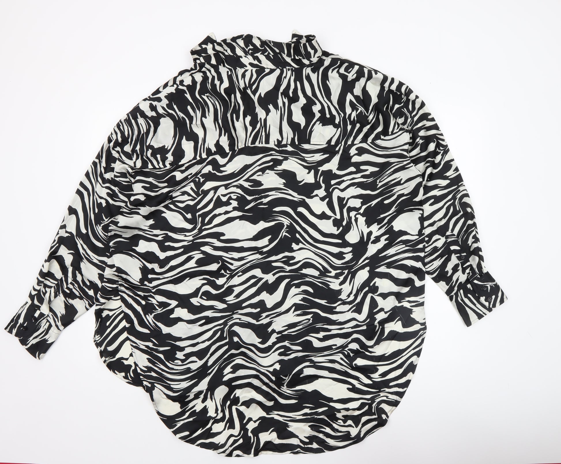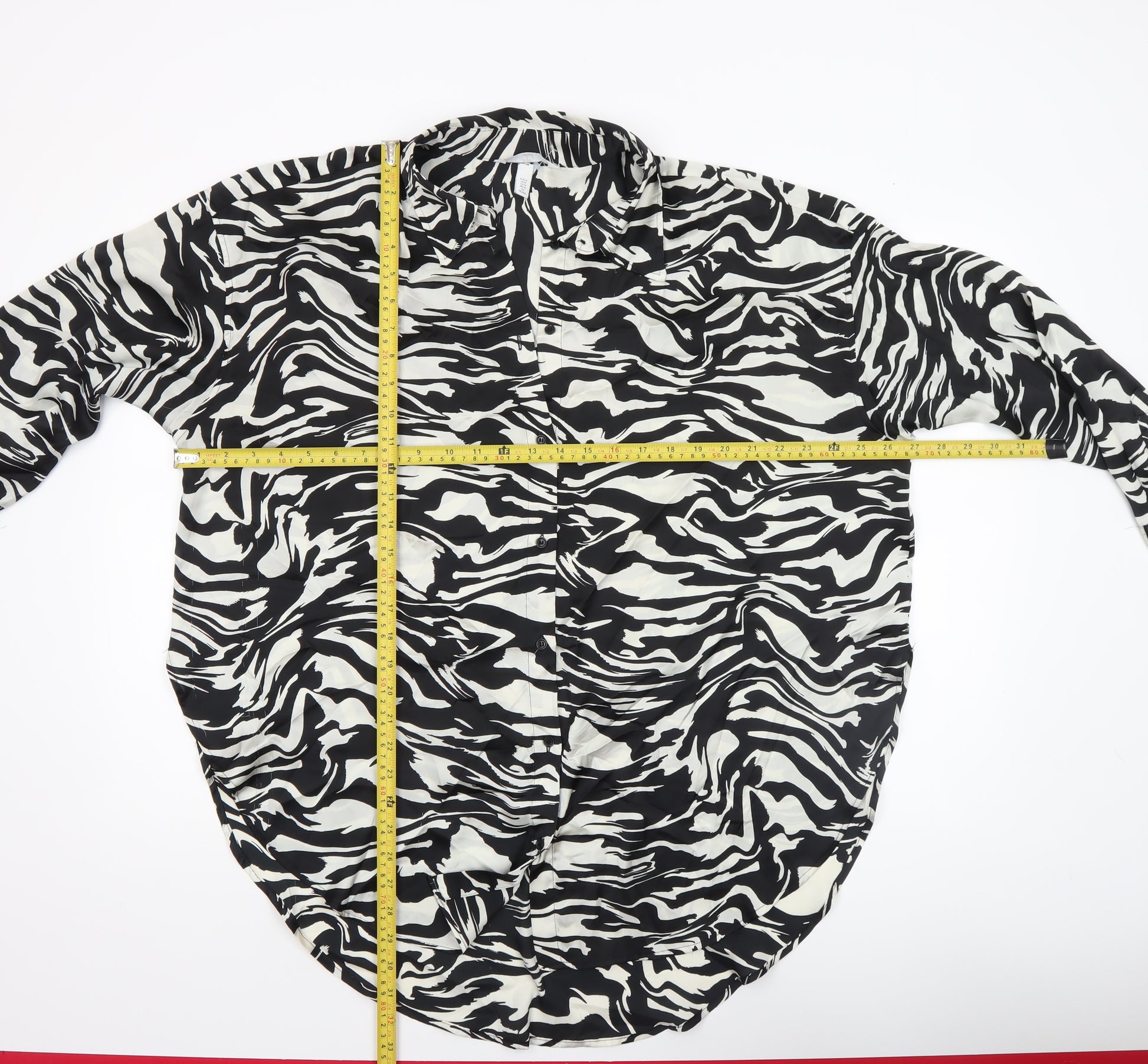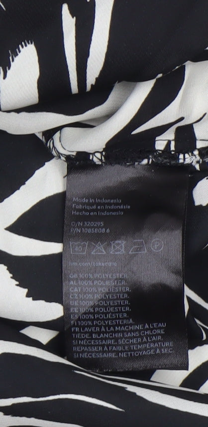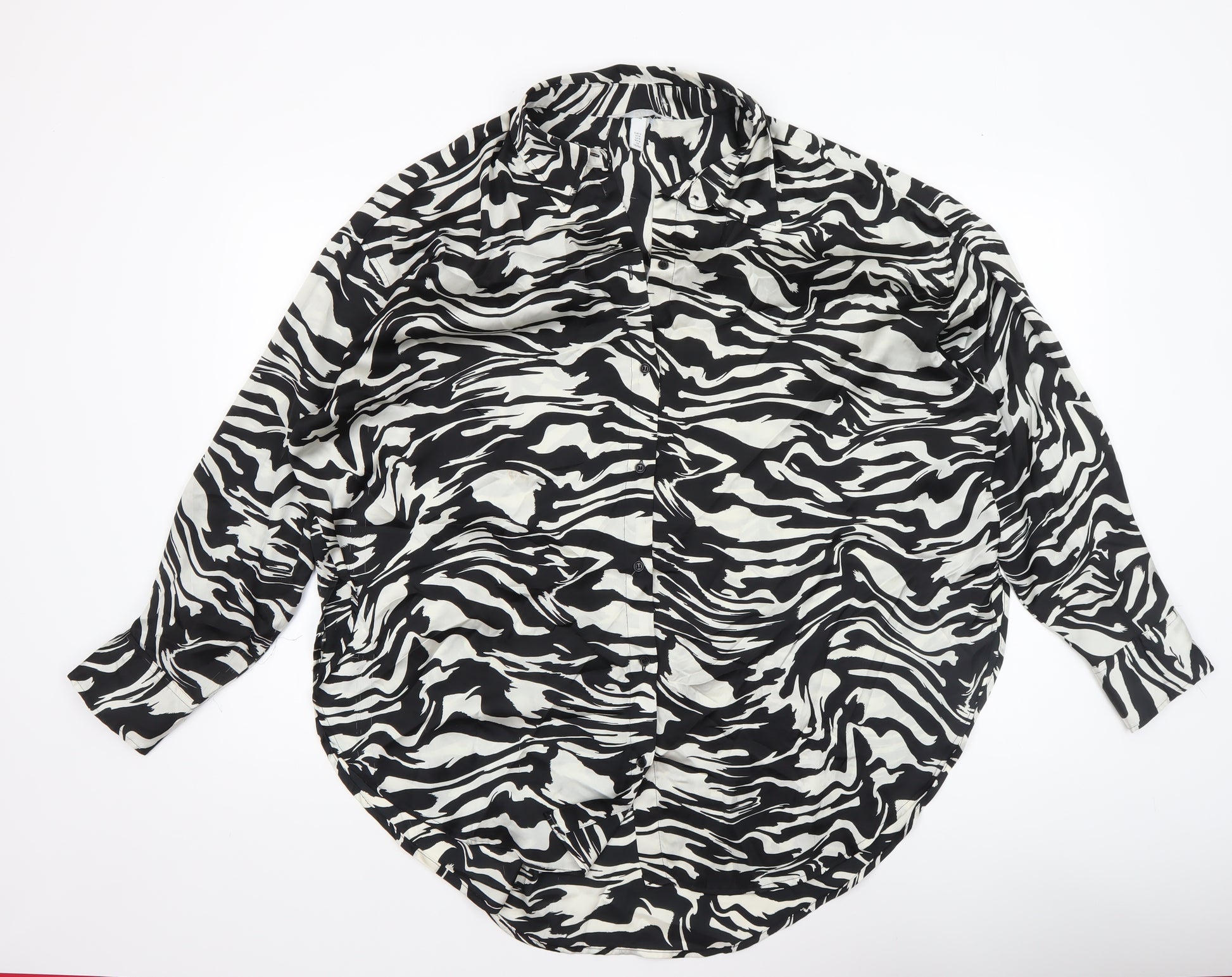 Add a touch of bold sophistication to your wardrobe with this eye-catching H&M women’s button-up shirt. Featuring a striking black and white animal print design, this top effortlessly blends contemporary style with everyday comfort. The shirt is crafted from lightweight woven polyester, making it perfect for year-round wear—comfortably cool in summer yet versatile enough for layering during spring and autumn seasons. The long-sleeve design and classic collared neckline give it a refined edge, ideal for both casual days or smart-casual occasions. Its button-up front creates a timeless and flattering silhouette suitable for different body shapes, while its regular fit ensures relaxed yet polished wearability. Designed for modern women, this shirt transitions seamlessly from office meetings to weekend outings. Pair it with tailored trousers for a refined workwear look, or wear it tucked into jeans for a more laid-back, stylish ensemble. The easy-care polyester fabric is machine washable, ensuring low-maintenance use and long-lasting quality. Offered in UK Size 12, it provides a flattering cut that sits comfortably against the skin. Its lightweight construction and smooth texture contribute to a breathable and elegant feel. Ideal for lovers of statement prints and minimalist palettes, this zebra-inspired piece captures confident, trend-forward femininity. Despite being gently used, the shirt remains in excellent condition with no visible flaws or signs of heavy wear. Stylish, versatile, and effortlessly chic, this H&M button-up shirt is a standout addition to any contemporary wardrobe, providing timeless appeal with a fashion-forward twist.