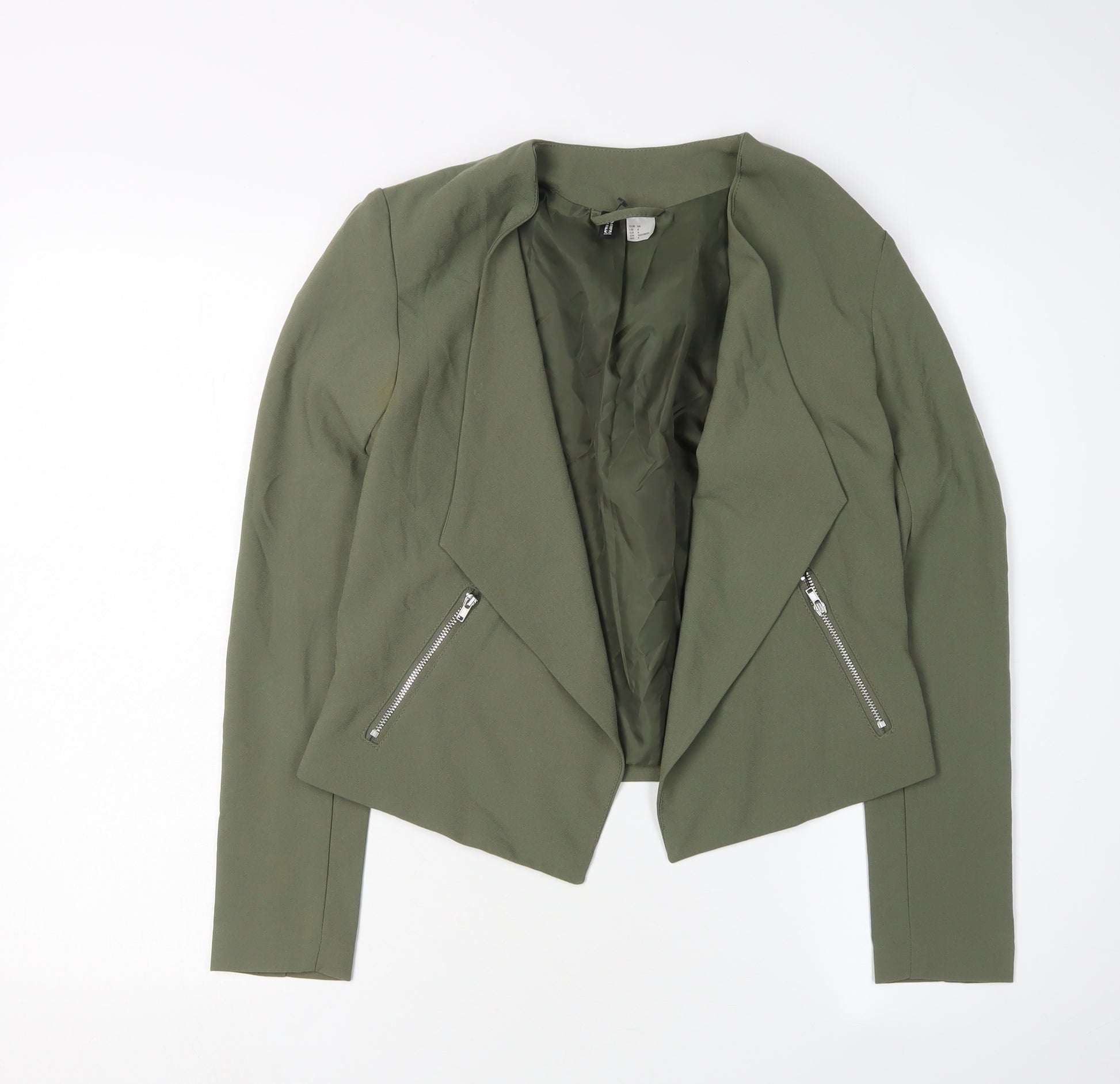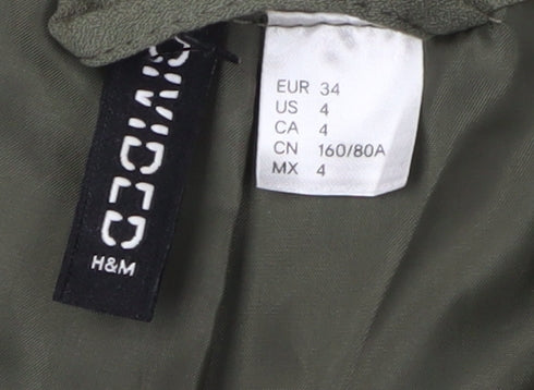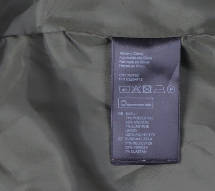 Elevate your casual wardrobe with this H&M women's blazer in a soothing green hue. Designed for regular wear, this lightweight jacket offers both comfort and style, making it a perfect addition for the autumn and spring seasons. The blazer is expertly crafted from a blend of polyester, viscose, and elastane, providing a smooth and flexible fit. It's machine washable, ensuring easy care and long-lasting durability.The blazer boasts a clean, no-pattern design with a regular coat length, making it versatile enough to pair with various outfits. Its long sleeves and absence of buttons give it a sleek, modern look. Inside, the lining crafted from 100% polyester provides a comfortable wear, ensuring you feel as good as you look.Whether you're heading to work or enjoying a casual day out, this green blazer adds a touch of elegance without compromising on practicality. The well-maintained condition guarantees you'll look polished from day one, with no signs of defects to detract from its charm. Make a stylish statement with this H&M blazer and experience a perfect blend of comfort and style.