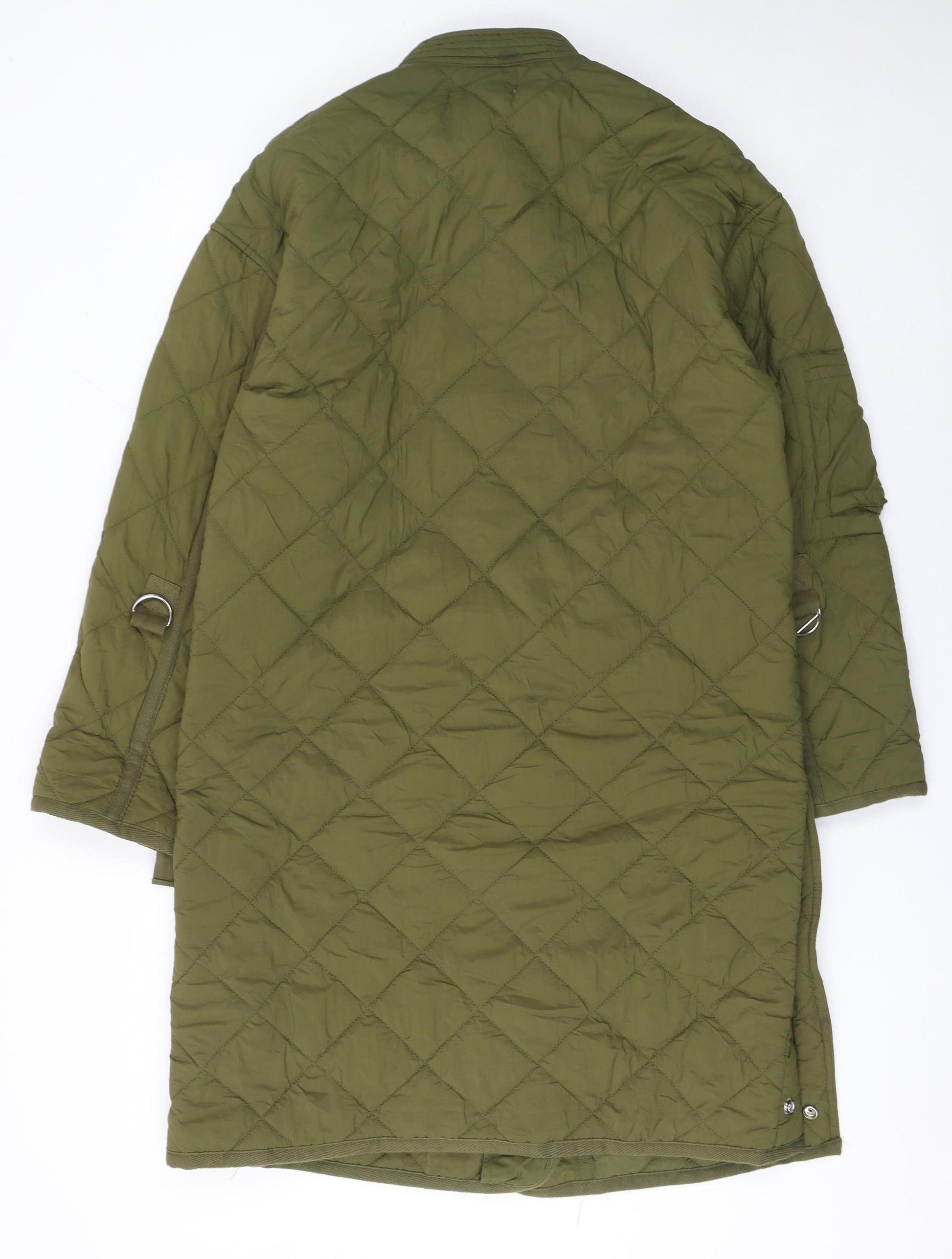 Elevate your outerwear collection with this stylish H&M Women’s Quilted Long Coat, designed to combine functionality and fashion for chilly days. Crafted from a durable 100% polyamide outer shell, this longline coat offers lightweight comfort while maintaining excellent protection against the elements. The smooth polyester lining ensures a cosy and comfortable wear, perfect for layering during autumn and winter. The deep green shade gives a timeless and versatile look that complements a wide range of outfits, from jeans and boots to dresses and trainers. Featuring a quilted design and secure zip front closure with additional snap fastenings, this coat provides both style and practicality. With two front zip pockets, it offers ample storage for your essentials while keeping your hands warm. The full-length cut makes it ideal for colder months, helping to retain body heat without compromising movement. Designed in a regular fit with long sleeves, it ensures comfortable wear for everyday activities. This coat’s minimal detailing and clean silhouette make it a wardrobe essential that never goes out of style.Perfect for casual outings, travel, or even the daily commute, this jacket combines sophistication with function. The exterior’s subtle gloss finish and quilted accents add texture and contemporary appeal. Machine washable for easy care and maintenance, this piece is made to last season after season. In excellent used condition with no visible flaws, this H&M coat offers great value for money for anyone seeking a reliable and chic layering option.Bring warmth, comfort, and understated elegance to your winter wardrobe with this H&M women’s green quilted coat — a practical and effortlessly stylish essential to elevate your seasonal outfits.