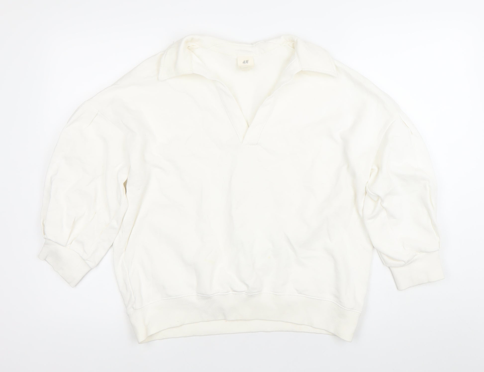 This H&M women’s pullover sweatshirt in a versatile white shade is a stylish and comfortable choice for casual, everyday wear. Designed in a simple yet chic style, it features a collared neckline which adds a touch of structure and uniqueness compared to classic sweatshirts. Made from 100% cotton, this piece offers breathable comfort and durability, making it perfect for layering or wearing on its own across multiple seasons. The sweatshirt comes in a size Small (UK S) with a regular fit that provides a comfortable yet flattering silhouette. The lightweight cotton jersey fabric makes it ideal for spring, summer, and autumn wear, while the pullover closure ensures easy styling. The raglan long sleeves offer a relaxed look, and ribbed cuffs and hem deliver a neat, slightly structured finish. Its plain white design ensures it can be styled effortlessly with jeans, leggings, or casual trousers, making it a wardrobe staple. With its machine washable fabric, this sweatshirt is easy to care for and ideal for women seeking low-maintenance, practical yet fashionable clothing. Though pre-loved and showing very light wear with faint marks consistent with gentle use, it remains in very good condition and has plenty of life left. This makes it a great buy for anyone looking for an affordable yet stylish casual top. Perfect for casual outings, walking, or lounging at home, this sweatshirt balances comfort and effortless style. Its minimalist design allows versatility, whether layered under jackets in cooler months or paired with shorts in warmer weather. As an H&M piece, it delivers everyday fashion at excellent value, making it a smart addition to your clothing collection. A reliable wardrobe essential, this collared sweatshirt offers timeless style in a neutral colour that pairs beautifully with almost anything.