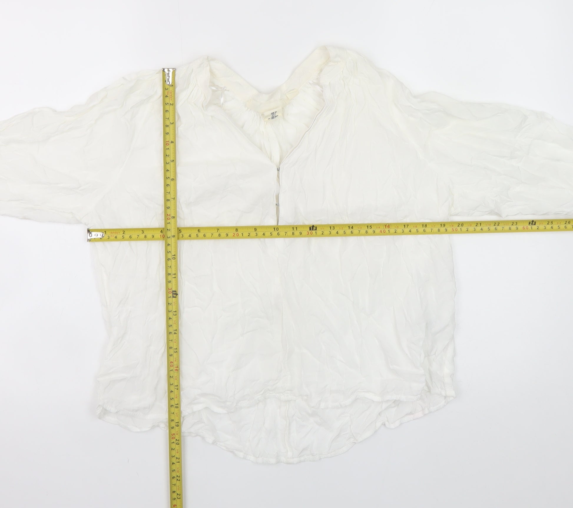This elegant H&M women’s white tunic blouse offers effortless style and comfort for everyday wear. Crafted entirely from 100% modal, it boasts a luxuriously soft feel and fluid drape that flatters the body. Lightweight and breathable, this blouse is ideal for spring and summer dressing, ensuring comfort even on warmer days. The relaxed fit design delivers easy movement, while the woven fabric construction gives it a polished, refined appearance suitable for a range of occasions. Featuring a flattering V-neckline with a half-zip accent, the blouse lends a touch of modernity to a classic silhouette. The long sleeves end in a softly gathered cuff, adding gentle volume and a relaxed bohemian feel. The crisp white hue enhances its versatility, effortlessly teaming with jeans, skirts, or tailored trousers for both casual and semi-formal settings. Designed under H&M’s L.O.G.G. (Label of Graded Goods) line, this piece reflects the brand’s focus on practical, timeless wardrobe staples with a touch of Scandinavian simplicity. The blouse’s modal fabric makes it naturally breathable and resistant to shrinkage, offering both durability and ease of care—machine washable at 30°C for your convenience. Perfect for layering, it can transition seamlessly from day to evening looks, making it a reliable addition to your everyday wardrobe. Condition is very good, showing only light general wear and creasing consistent with careful previous use. With its relaxed fit, minimalist design, and comfortable construction, this white H&M tunic blouse is an essential go-to piece for modern women seeking an effortlessly chic aesthetic.