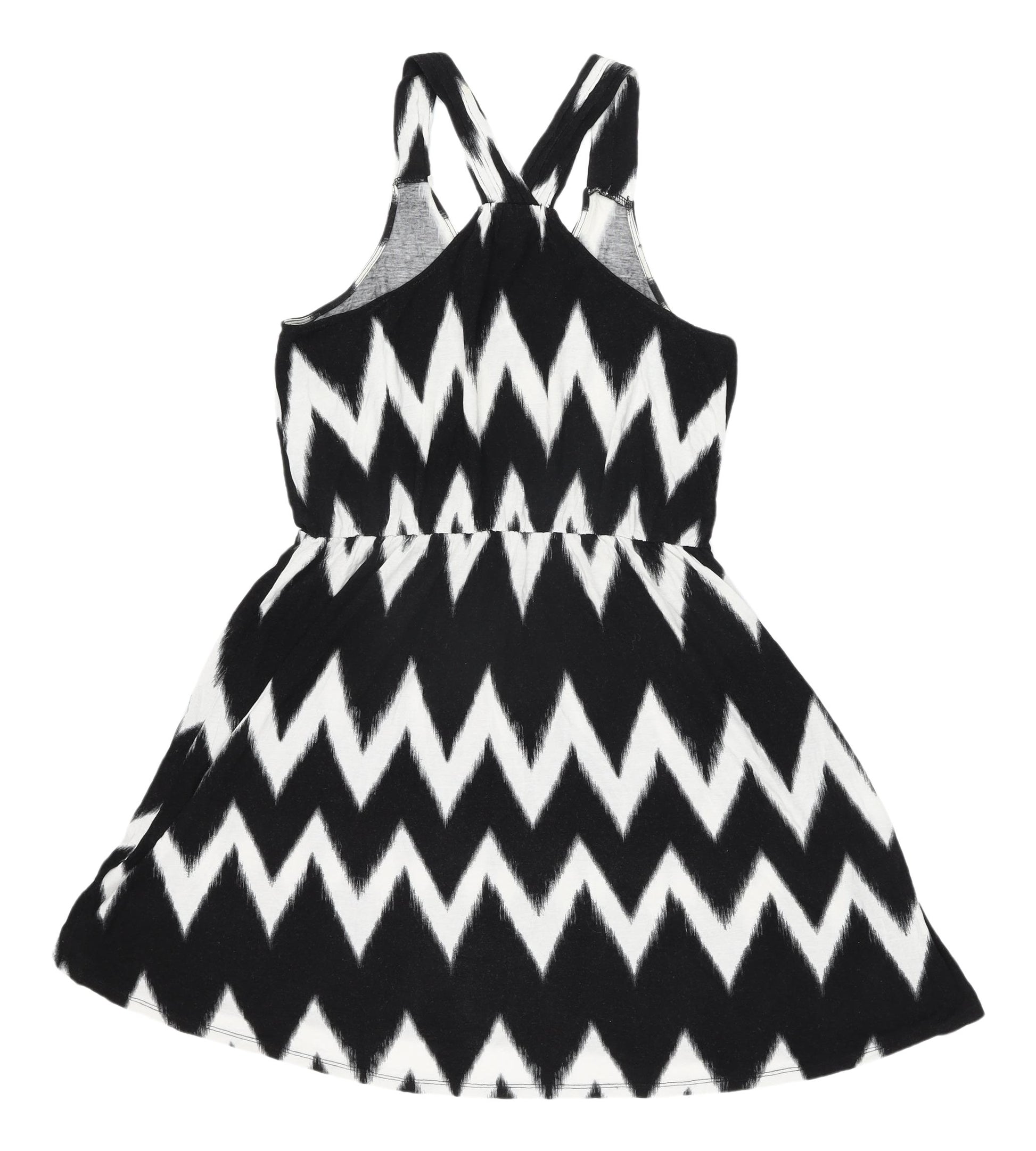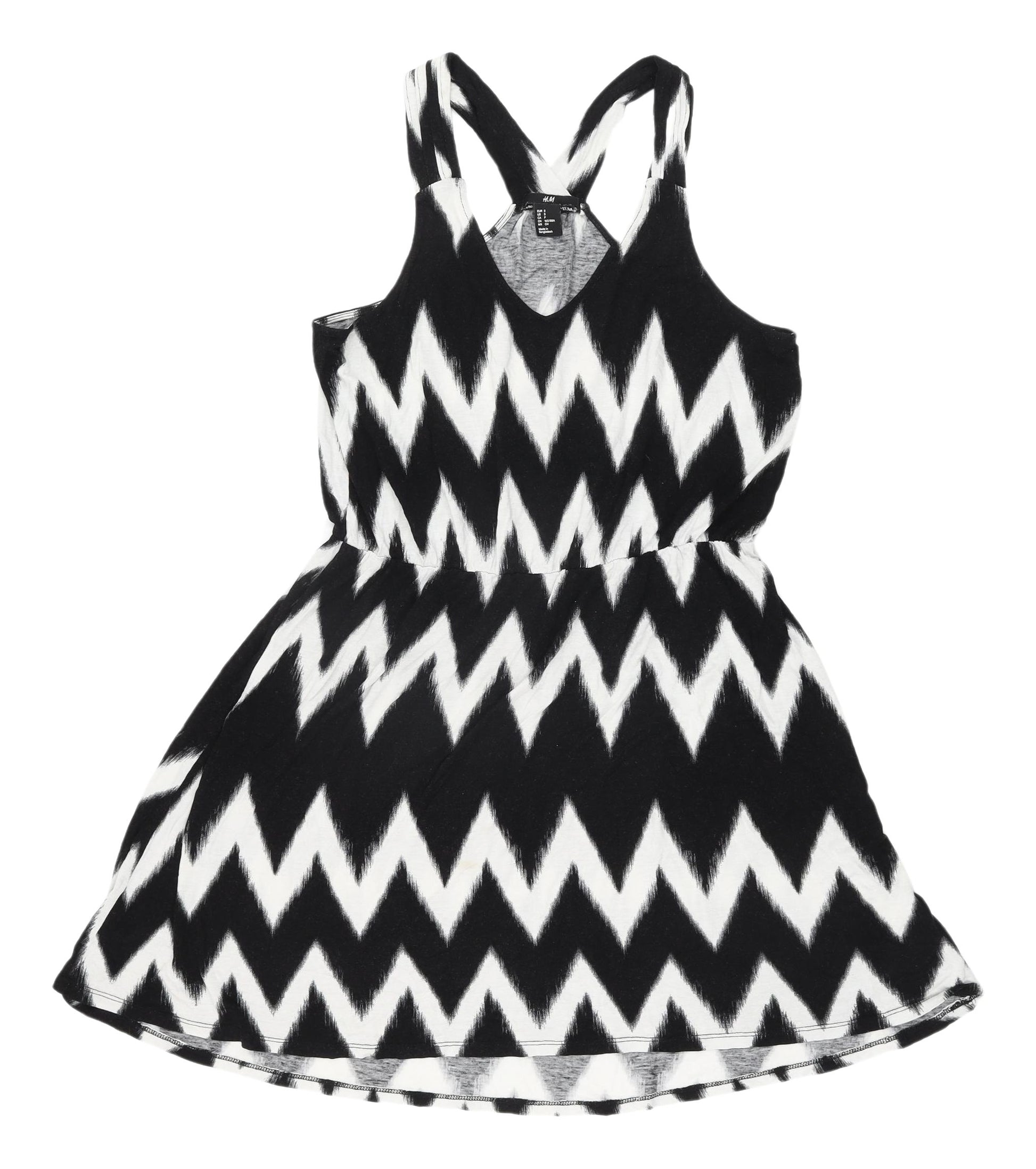 This chic H&M Women's A-Line dress in classic black and white chevron pattern is perfect for casual summer days. Made from soft viscose, it offers a lightweight and comfortable feel. The sleeveless design and strappy sleeves enhance its breathable character for warm weather. The dress features a V-neckline and a pullover closure for easy wear. Whether you're headed for a day out or a casual outing, this versatile dress ensures you look stylish effortlessly. In excellent condition, this piece is machine washable for easy care. Its simple yet striking pattern makes it a timeless addition to any wardrobe.