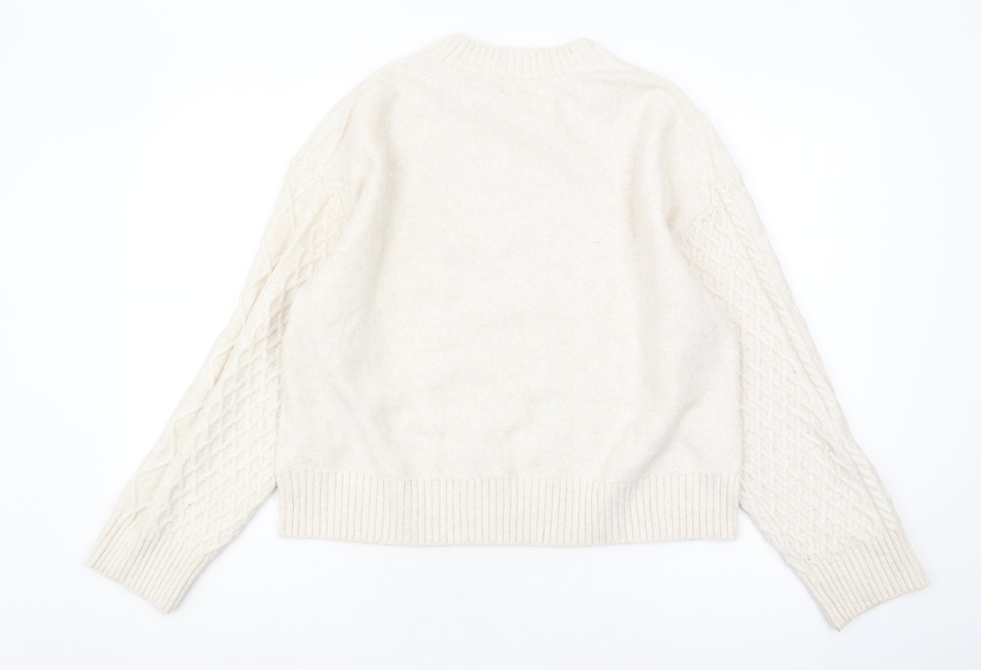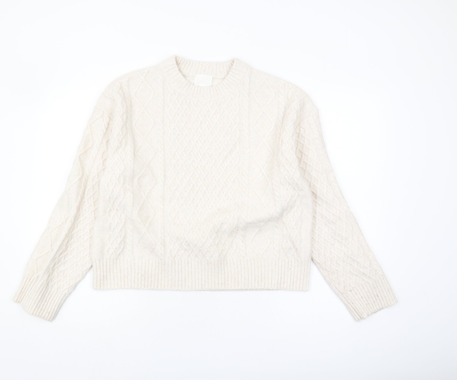 Step into cosy elegance with this exquisite H&M Women's Jumper. Crafted in a classic cable-knit design, this beige jumper is perfect for the autumn and winter seasons. Featuring a comfortable crew neck and long sleeves, the jumper combines style with warmth, making it an ideal choice for days when temperatures drop. Made with a blend of polyester, acrylic, and wool, the knit fabric ensures both durability and comfort. The neutral beige tone provides versatility, making it easy to pair with various wardrobes for everyday casual wear. Despite being gently used, this jumper remains in very good condition, offering minimal signs of wear, allowing you to enjoy stylish autumnal outfits without sacrificing quality. Perfectly suited for a casual occasion, it seamlessly blends into any wardrobe, promising to keep you warm and fashionable. Grab this fabulous piece before it’s gone and add a touch of H&M elegance to your collection.