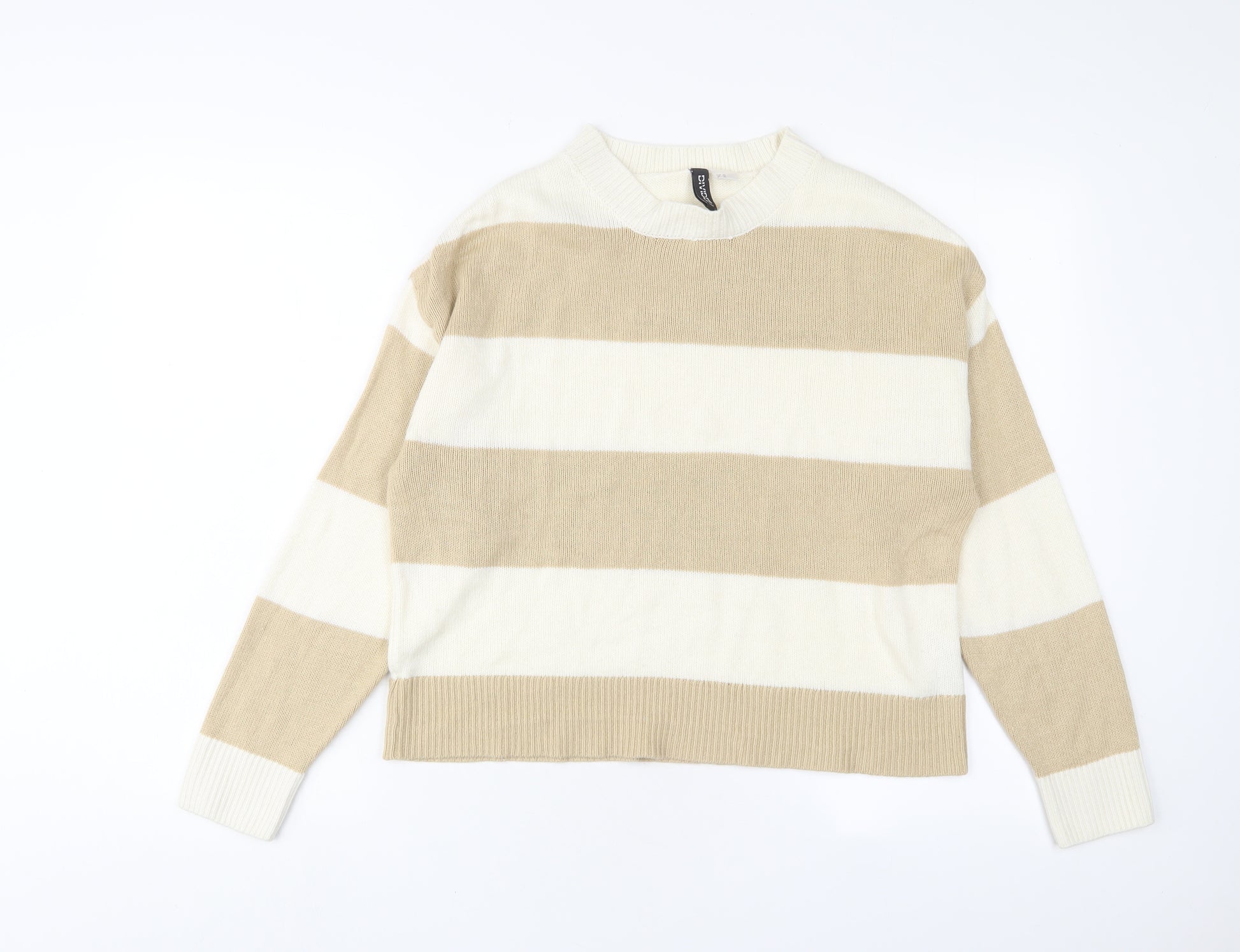 Womens Beige Crew Neck Striped Acrylic Pullover Jumper Size XS