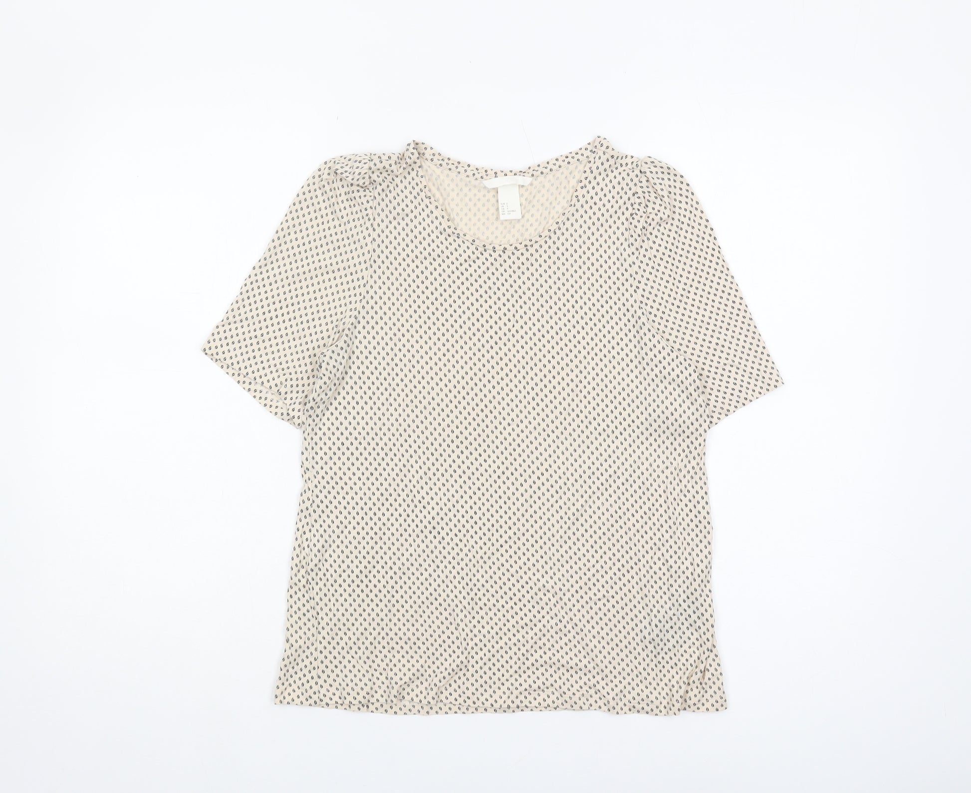 Elevate your everyday style with this charming H&M Women's T-Shirt, perfect for a casual yet chic look. Crafted from soft 100% viscose fabric, this beige top features an eye-catching geometric pattern that adds a subtle hint of sophistication to any outfit. The short sleeves and classic crew neck design ensure a comfortable fit, making it an essential addition to your wardrobe. Ideal for women who appreciate timeless fashion, this regular-sized T-shirt is machine washable, ensuring easy care and convenience. Despite being in excellent condition with no visible wear, this versatile piece is offered at a budget-friendly price, making it a fantastic choice for fashion-forward individuals. Pair it with jeans or trousers for a perfect blend of casual elegance, and let the charming H&M style take you through any season with ease.