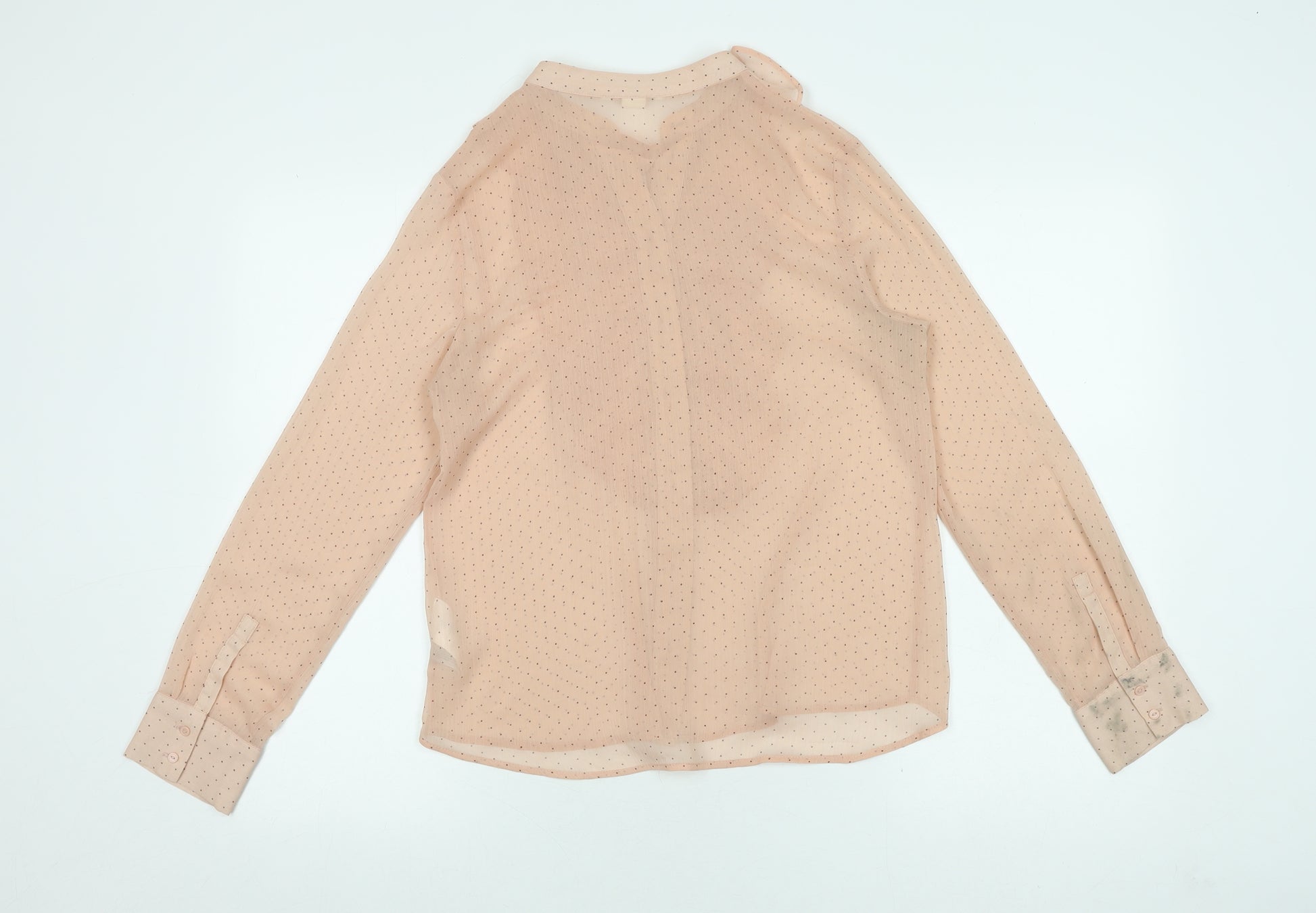 Elevate your wardrobe with this chic H&M Women's Blouse, a must-have for effortless styling. Crafted in a delicate beige hue with playful polka dots, this blouse offers a blend of sophistication and flirtatious charm. The ringer style is accentuated with an elegant collared neckline, and topped with stylish ruffles cascading down the front, ensuring you make a statement at any occasion. Constructed from lightweight woven polyester, it offers a comfortable fit with its regular size 6 specification. The long sleeves provide a flattering silhouette, making it an ideal choice for cooler weather. Despite some staining on the cuffs, this piece remains in good condition, perfect for those seeking an affordable yet fashionable addition to their closet. Pair it with your favourite jeans for a casual look, or wear it under a fitted blazer for that business-ready appeal. A machine washable garment care ensures easy maintenance, helping you keep this wardrobe staple in its best shape. Don't miss out on adding this versatile piece to your collection.