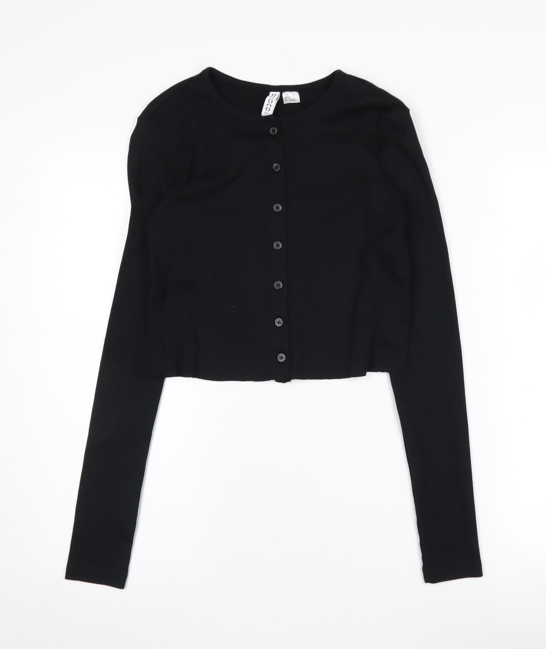 Elevate your wardrobe with this versatile H&M women's cardigan in classic black. Perfect for layering, this piece features a crew neck and long sleeves, making it ideal for casual occasions. Crafted from 100% cotton, it offers a comfortable and breathable fit. This cardigan sports a button accent and smooth knit fabric, ensuring you stay stylish and warm throughout all seasons. The regular fit and size S make it a great choice for everyday wear, whether you're heading to work or meeting friends for a casual outing. Machine washable for easy care, this H&M cardigan is a must-have for any fashion-conscious woman. Despite being in excellent condition with no visible defects, it offers a chic and modern look. Grab this stylish cardigan today and add a touch of elegance to your ensemble.