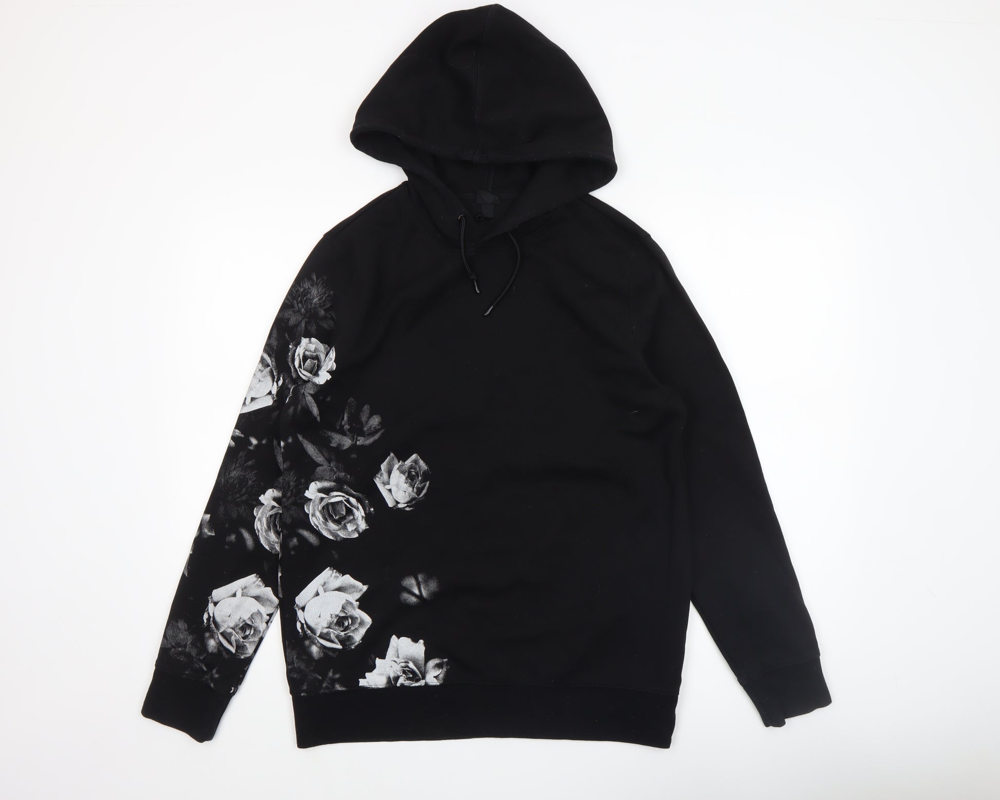 Elevate your casual wear collection with this stylish black pullover hoodie by H&M, designed for women who appreciate comfort fused with contemporary flair. Crafted from a soft cotton blend, this hoodie ensures a breathable yet cosy fit that keeps you comfortable across seasons. The medium thickness of the fleece-like material makes it perfect for layering during cooler days while still remaining lightweight enough for transitional weather. The standout feature of this piece is its elegant floral pattern in contrasting tones of grey and white, giving the hoodie a distinctive artistic edge. The design is tastefully positioned across one sleeve and lower body area, providing a unique yet balanced aesthetic. The drawstring hood adds a practical touch, allowing for adjustable comfort and extra warmth when needed. Ribbed cuffs and hem help maintain the shape while adding structure to the relaxed silhouette. This hoodie’s pullover closure makes it effortlessly easy to wear, ideal for active days or relaxed evenings. Whether styled with leggings for a casual outing or paired with jeans for an effortlessly chic look, this piece offers versatility that fits seamlessly into any wardrobe. Suitable for both women and teens, it embodies modern street style while maintaining a touch of feminine charm through its floral accents. Its durable cotton construction ensures lasting quality and ease of care, being machine washable for everyday practicality. The overall condition of this item is excellent, showing minimal signs of previous wear. An ideal choice for casual, outdoor, or everyday occasions, this black floral hoodie can be a signature staple for those who value both comfort and fashion. Designed to flatter without compromising on function, this hoodie will easily become a go-to favourite in your rotation.