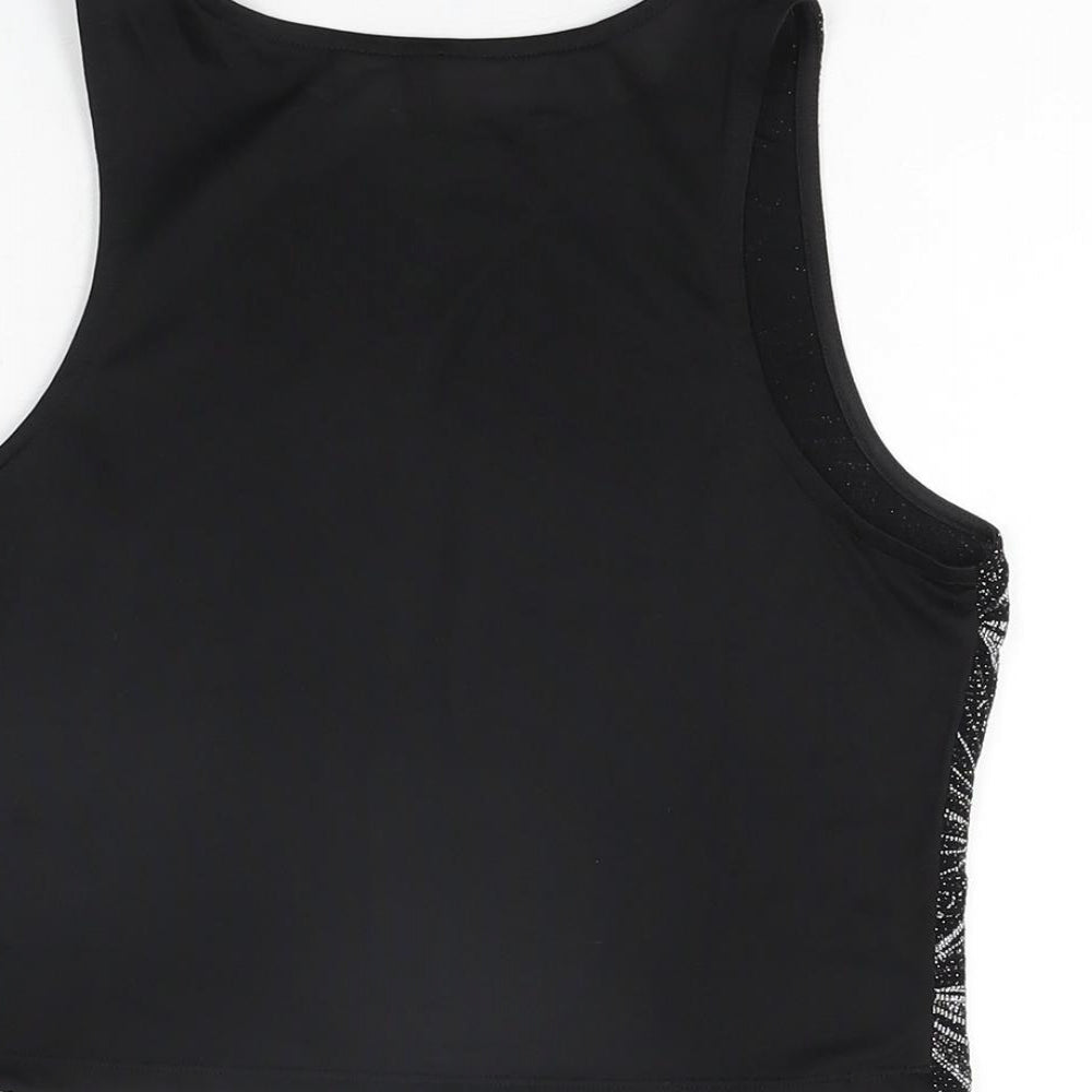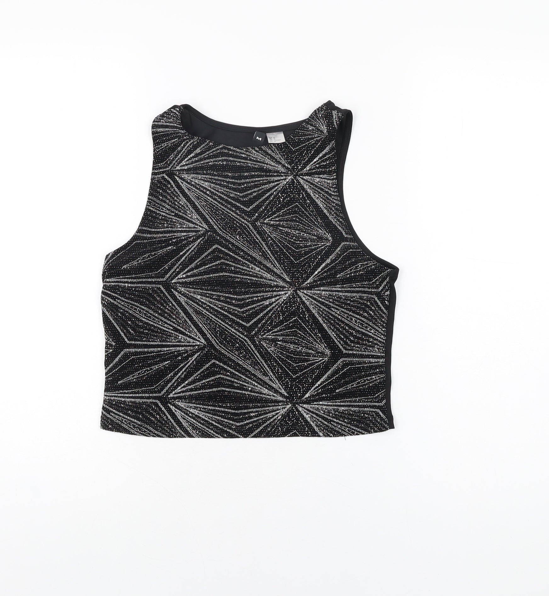 Womens Black Geometric Polyester Cropped T-Shirt Size M Round Neck